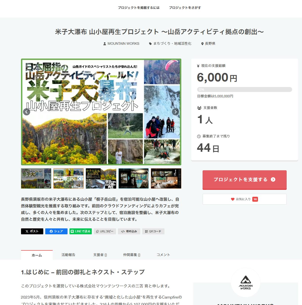 米子大瀑布・山小屋再生プロジェクト第二弾、クラウドファンディング開始しました!