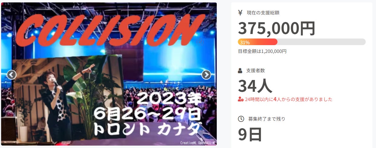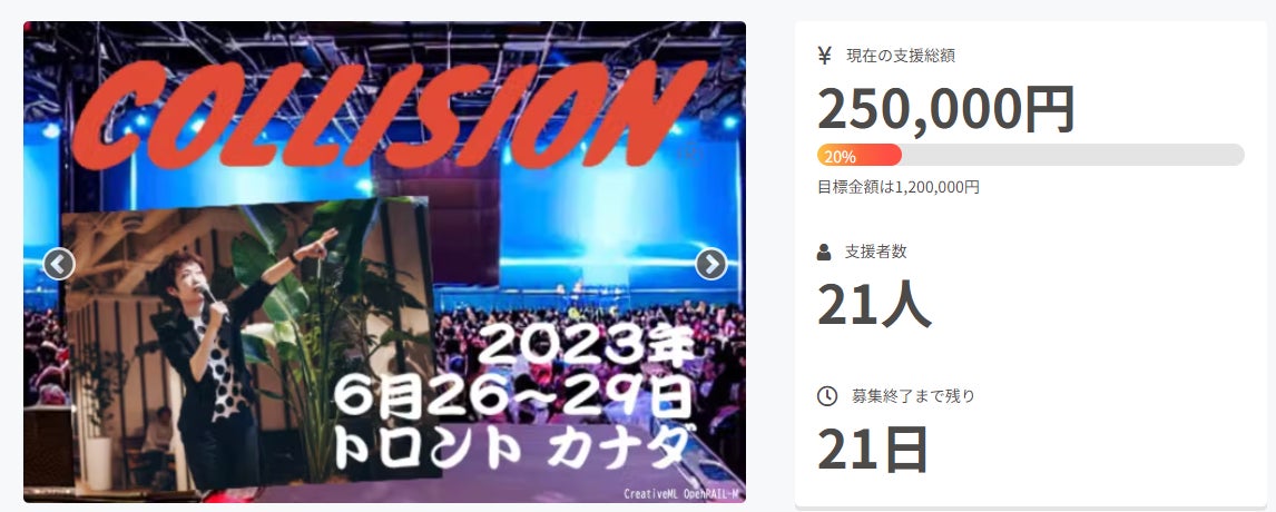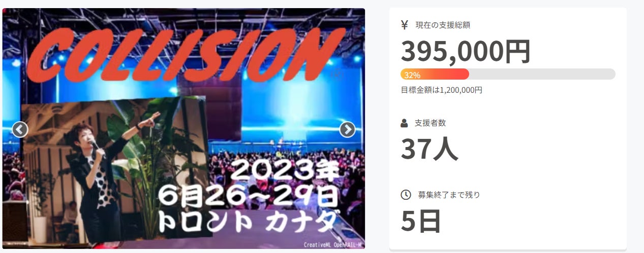 こんにちは、インキュビオンの柴です。これまでにご支援いただいたみなさん、お気に入り登録やSNSでの拡散・応援のお声掛けなどさまざまな形でご協力いただいているみなさん、本当にありがとうございます。いただいたご声援の全てが、当社メンバー全員の大きな力になっております。【活動報告】目標金額の25%、30万円を突破しました!ご支援いただいた金額の合計が30万円を越えました!目標額の25%にあたります。みなさんのお力添えのおかげでここまで来れました。しかし、この時期のカナダはハイシーズンとなるため、手頃な航空券が埋まる前に、次の目標である「1人分のフライトチケット代=手数料込み50万円」に向けて頑張っていきたいと思います!どうか引き続き当プロジェクトのシェアにご協力をお願いいたします。モノ系のような華やかなプロジェクトではないため、当プロジェクトにご賛同くださった方からのご紹介や「お気に入り登録」の件数で注目度が大きく変わります。なにとぞご支援いただければ幸いです。【お知らせ】インキュビオンのExhibition dayが6月28日(水)に決まりました。Exhibition dayは、会場内に当社占有のイベントスペースブースを確保して製品を展示し、来場者に直接紹介できる機会です。世界各国のメディアや投資家にプロダクトを実際に触っていただくチャンスであると同時に、ロゴやお名前を掲示するリターンの実施日でもあります。 当日の様子は活動報告からお届けいたしますので、どうぞお待ち下さい!↓Collision主催者からのメール(抜粋)その他、当社の情報はCollision2023のwebページでも紹介されています。よろしければご覧ください!引き続き皆さまのご支援をどうぞよろしくお願いいたします。