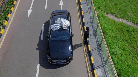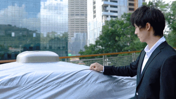 「Vinoya」を車に取り付けて、ワイヤレスリモコンの「ON」ボタンを押すとカーカバーが自動的に開きます。