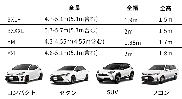 ・横幅あるいは高さが表の数値通りでなくても問題ありません。横幅と高さは補完されるため、合計値でご検討ください。(例:長さは4.8m、横幅は1.8m、高さは1.6mの場合にも3XL+を利用できます。)