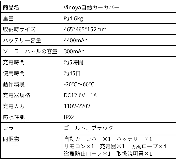 自動カーカバー「Vinoya」(ヴィノヤ)主な特徴: