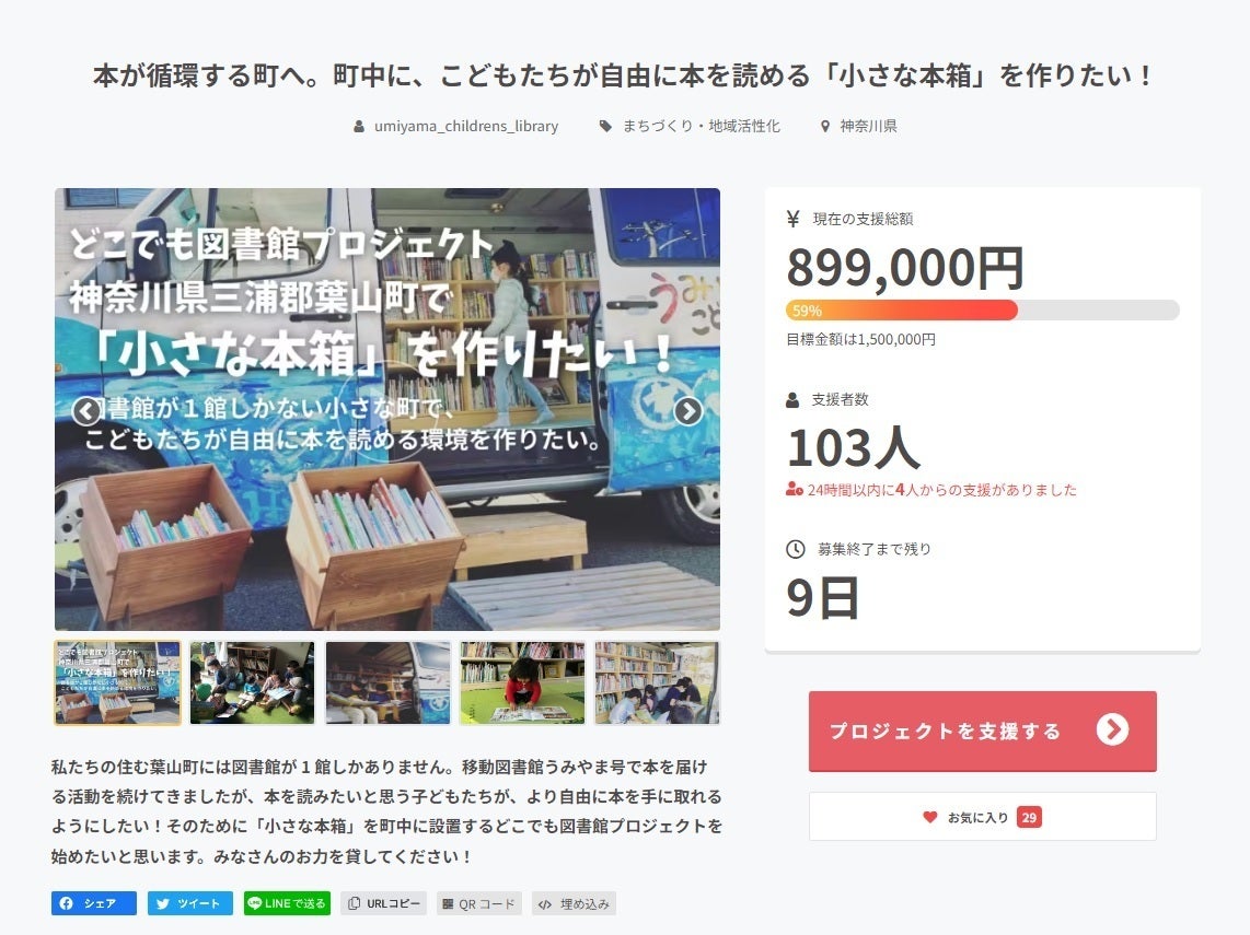 この度は、たくさんの支援をいただきありがとうございます。6月18日(24時)をもちましてどこでも図書館プロジェクト「本が循環する町へ。町中に、こどもたちが自由に本を読める「小さな本箱」を作りたい!」の、ご支援募集期間が終了いたしました。165人の方よりご支援をいただき1,353,500円もの資金を集めることができました。ありがとうございます!設定した150万円という目標金額には届きませんでしたがリターン品なしのご支援をくださる方が多く返礼品にかかる費用が想定よりも少なくなりましたので本箱30個を作成することが可能となりました!みなさまからのご支援のおかげです。本当に本当にありがとうございます。また、クラウドファンディング開始の5月7日から6月18日までの43日間ご支援くださったみなさまはもちろんこのプロジェクトをお知り合いへ伝えてくださった方々ちらしを貼ってくださった方々応援メッセージをくださった方々の存在がとても大きくたくさんの力に支えられている活動だと、日々実感しながらプロジェクトを進めることができました。心より感謝申し上げます。ありがたいことに、本箱設置希望の方からのご連絡も多数いただいております。これから、本箱の作成を一般社団法人 葉山の森保全センター(HFC)に依頼し設置完了は10月を予定しています。今後の活動もSNSで発信していく予定でおりますので温かく見守っていただければ幸いです。新たなスタートラインに立ちこれからもより一層尽力してまいりますので引き続き変わらぬご支援をお願い申し上げます。うみとやまのこどもとしょかん植田