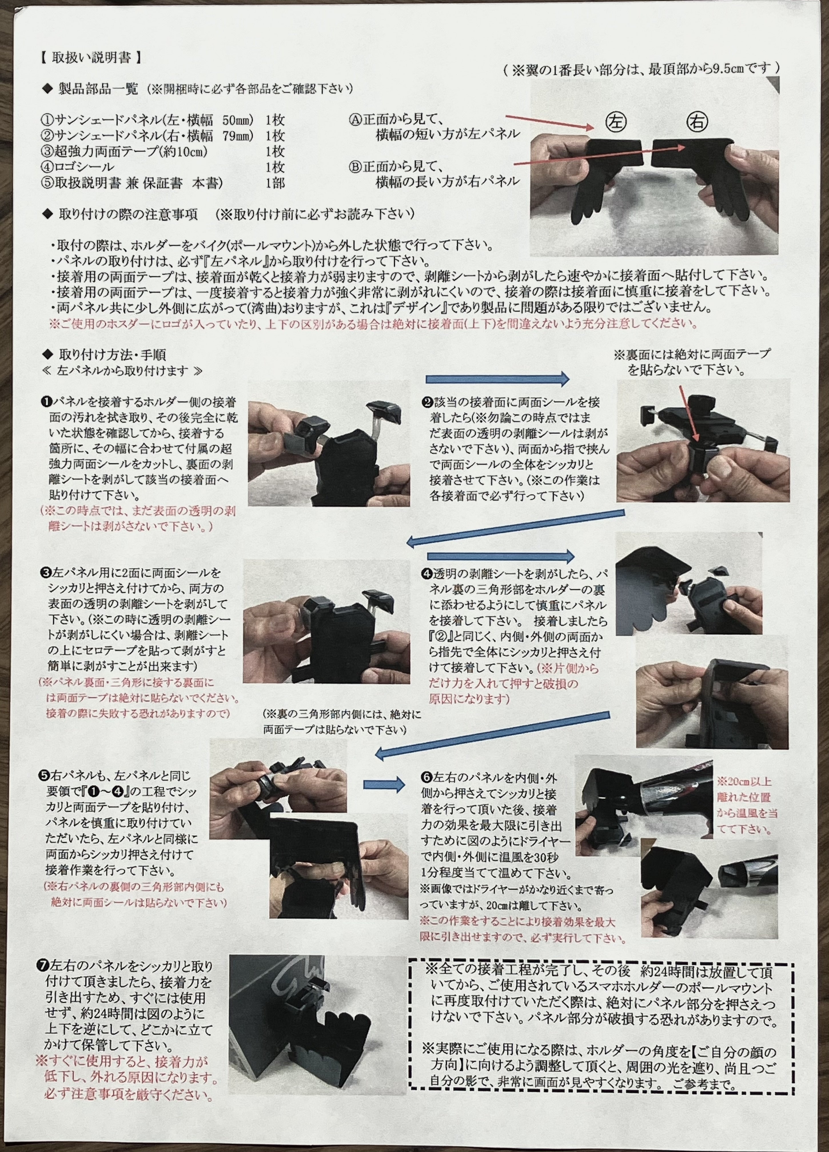 私は、バイクが好きでよくツーリング等にも出掛けているのですが、約2年前より副業として『フードデリバリー』もしております。 ツーリングをしている時も勿論なのですが、デリバリー業務をしているときなどは特に夏場の直射日光の強い季節などにはスマホホルダーにセットしているスマホの画面に直射日光が当たって光ってしまい、画面が全く見えない・見えずらいので走行中にスマホに顔を近づけて凝視することにより危険な場面に遭遇したことが何度もありました。 ある時、YouTube動画で同じようにフードデリバリーを副業でされている方が『自作のスマホホルダー用のサンシェード』を紹介されているのを観て『これは良いな!』と思い、(思いついたらすぐに行動しないと納得できない性格なもので)早速材料を買い揃え、自分なりに【あ~でもない、こ~でもない..】と試行錯誤を繰り返し、自分のなかではなんとか納得のいく試作品を作成し(といっても構造は至って簡易な商品ですが)、早速ホルダーに装着して使用してみると、(自己満足ですが)予想以上の遮光効果に一人でニヤニヤしてしまうような商品に仕上がりました。 その後、その試作品の改善点を見直して第2弾を作成して街中を走っていたところ、信号待ちをしている際に全く見知らぬバイカーが私の真横に寄ってきて、試作品のサンシェードを指さして【それ良いですね! コンパクトだし! それどこのメーカーですか!? 通販で買えるんですか!?】という質問を受け、また別の日にもまた違う人からも同じ質問を受け.. 【これだけ見知らぬ人がわざわざ声をかけて聞いてくるということは、やはりそれだけ他のバイカーも同じ支障(画面が見えない)に悩まされていて、何とか解消できる製品はないものか!?・どこかのメーカーが何とか解消できる製品を開発・販売してくれないものか!?と思っているんだな..】とボンヤリとした感覚でその時は思っていたのですが、すぐに【自画自賛ではないけれど、見知らぬ人がこの試作品を見て≪どこかで市販されている製品だと勘違いする≫ほど興味を示してくれたという事は、これはもしかして駄目もとで商品化に向けた取り組みをして実際に販売まで漕ぎつければ需要はあるかも! 困っている人達の支障(ストレス)を解消してあげれる・危険な場面に遭遇しないようにしてあげられるのでは!】と思い、まずは製品作成には欠かせない特許申請などの資料作成に取り掛かったというのが、今回の試作品を実際に商品化しようと思った経緯です。 (※2023年1月25日付けにて【一体化の商品】としての特許(意匠登録)は取得済み) ※正確には【スマホホルダーとサンシェードが一体化した製品としての意匠登録は取得済み】であり、今回実際に販売する製品は【※サンシェード部(左右のパネル)の部品としての販売】となる為、2023年4月末までに【部品】として新たに【意匠登録】を申請済みです。