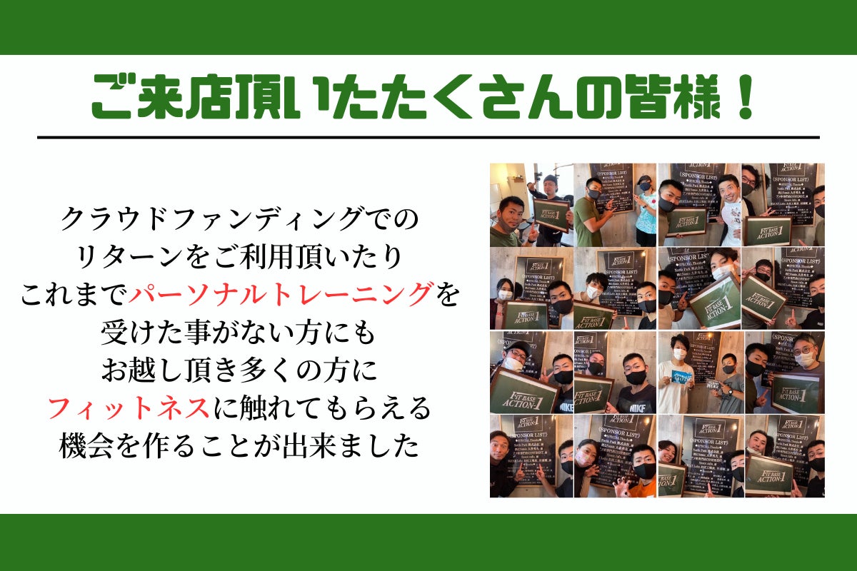 身体作りに悩むお客様が理想を叶える場所にするため、多くのお客様をお迎えし快適な空間でボディメイクを行える環境を作るため、そして3年目のスタートダッシュを切るために、このプロジェクトを通してたくさんの方に応援していただきたいと思っています。