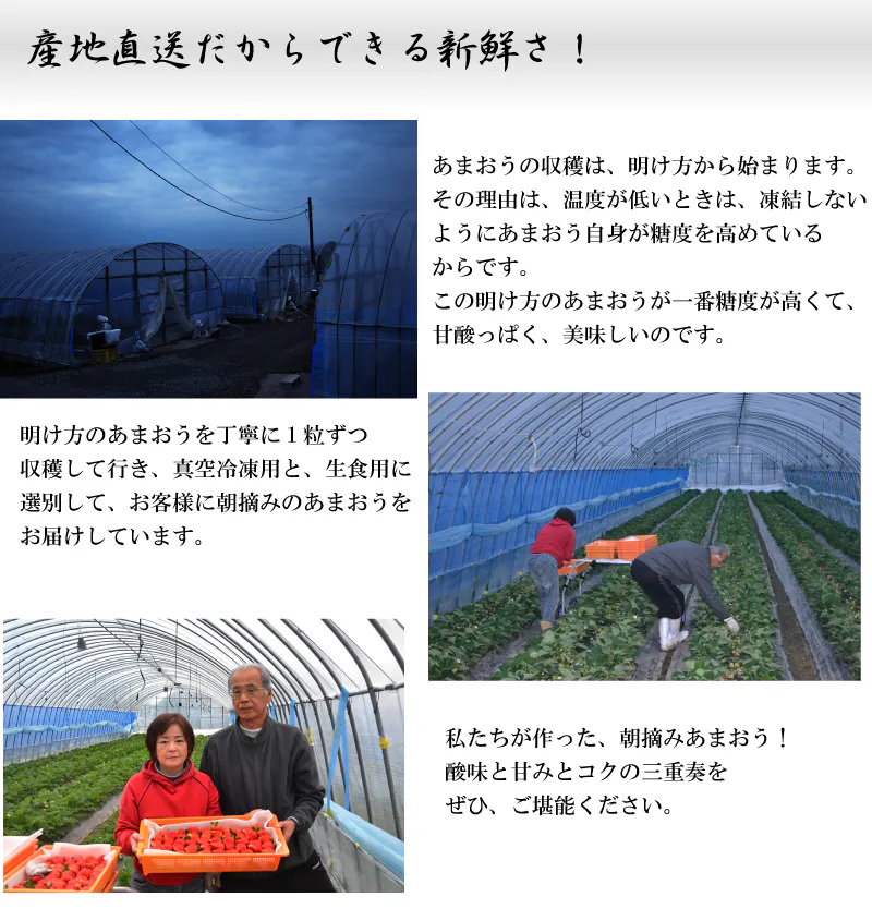 収穫して、その日のうちに真空クイックフリージング!好きな時に新鮮なあまおうをご賞味いただけます♪