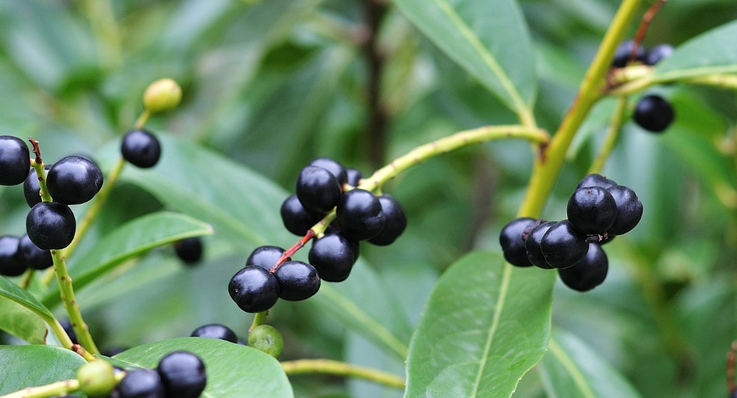 雌株のローレルは黒紫色の実がなります。
