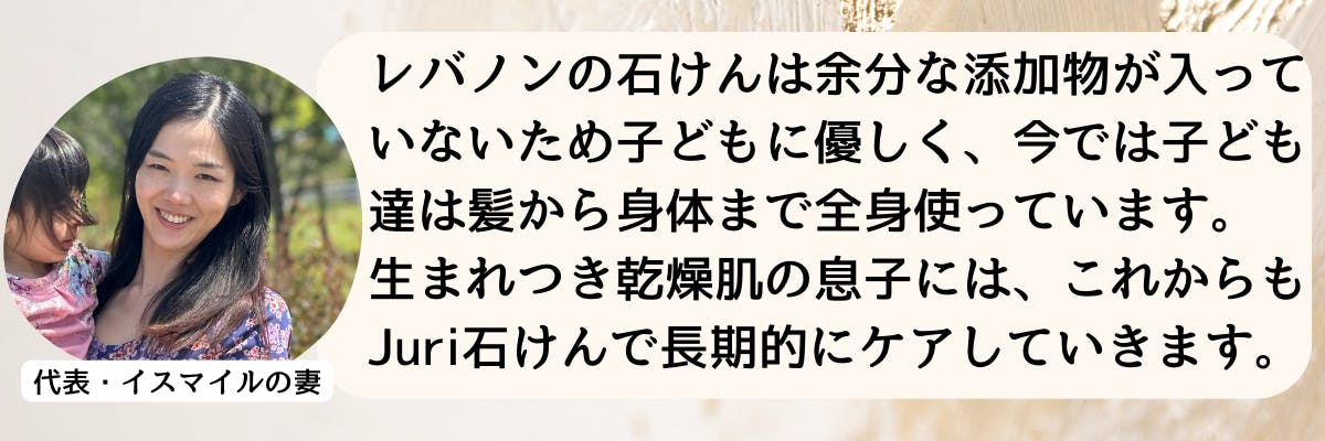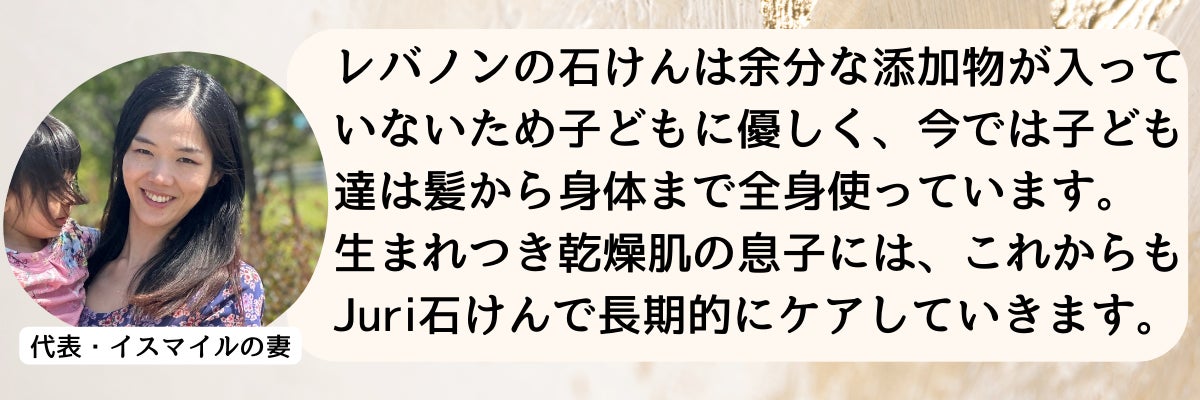 レバノンでは馴染みの深いローレルベリーオイルをメインで使った無添加の石けんを、ぜひ日本の皆様に気に入っていただき、多くの人に愛用していただける商品になればと思っています。
