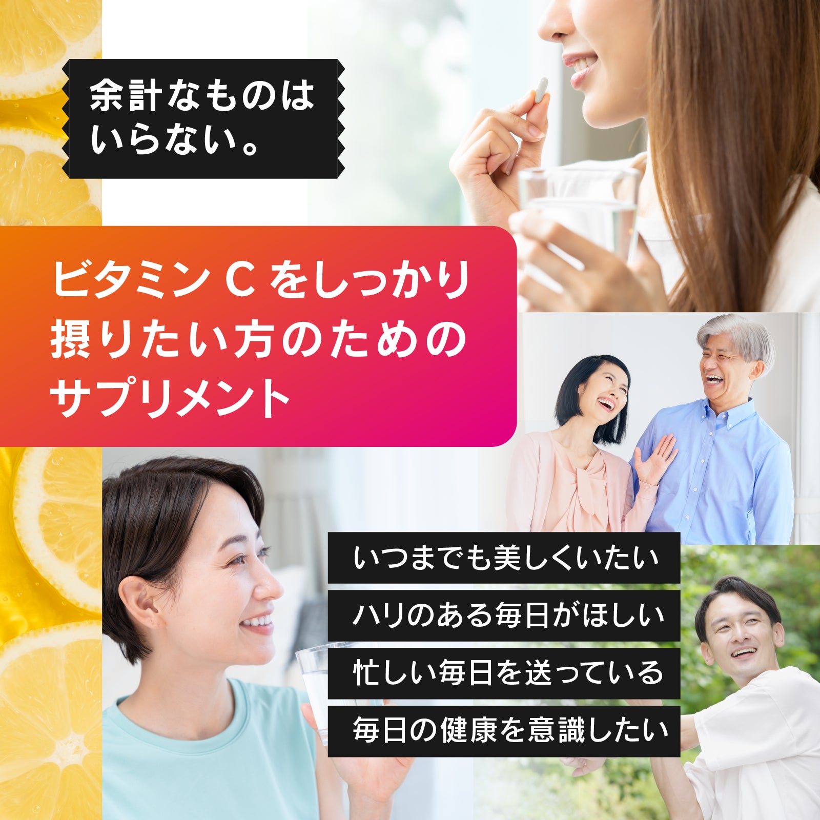 実際に、妻や女性スタッフ、友人などに聞いても男性は、アンチエイジングなど気にせず結婚したらぶくぶく太って自分のことは棚に上げて…人には「最近太った?シミ増えた?」など言う夫が多いと不満が多く出ておりました。なので男女関係なく使用できるサプリを作って永遠に悩みがない世界を作りたいと願っています。