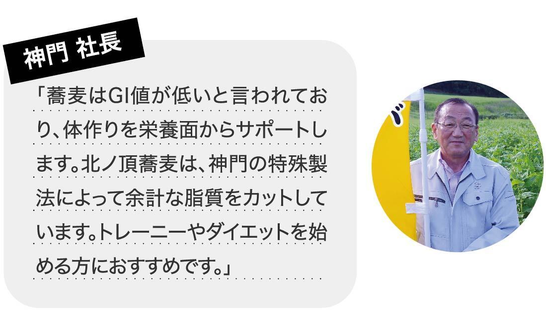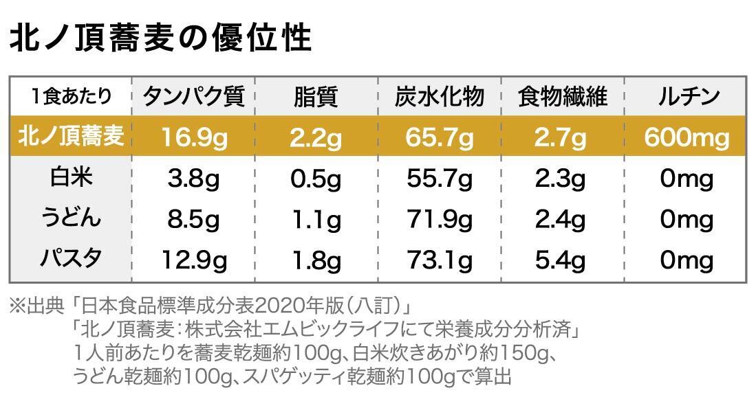 「北ノ頂蕎麦」は、一般的な白米やうどんに比べ、タンパク質が豊富に含まれます。