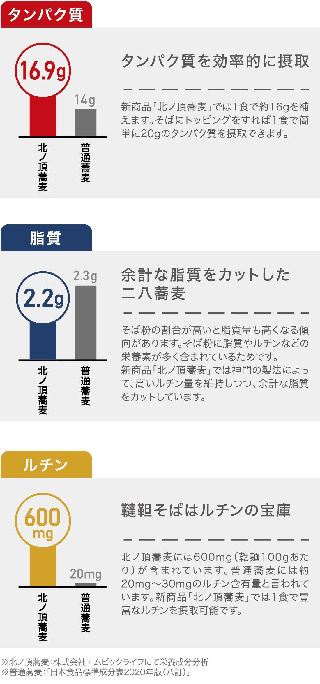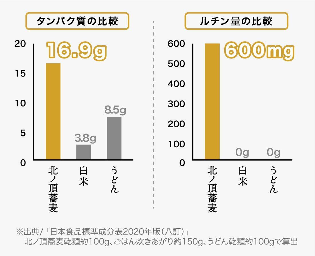 「北ノ頂蕎麦」は、一般的な白米やうどんに比べ、タンパク質が豊富に含まれます。