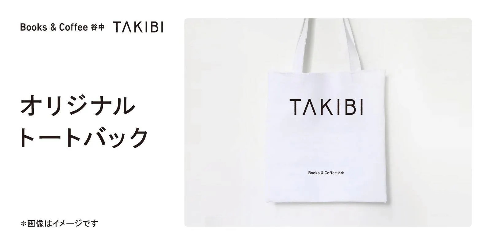 TAKIBI特製のトートバッグとブックカバーをセットでご提供。※TAKIBI特製ステッカー(60㎝×70㎝)&TAKIBI特製缶バッジ(44㎝/直径)も合わせてお送りします。