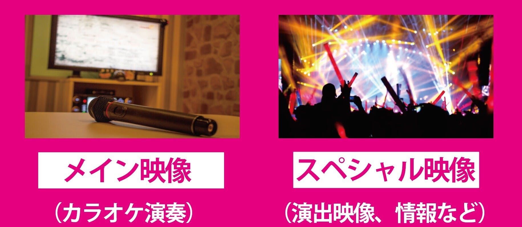 2つの異なる映像を同時に再生するデュアルモニター機能が搭載されております。メイン映像では通常のテロップ入りカラオケを、一方のスペシャル映像では、空間をさらに盛り上げる特別映像などを表示します。