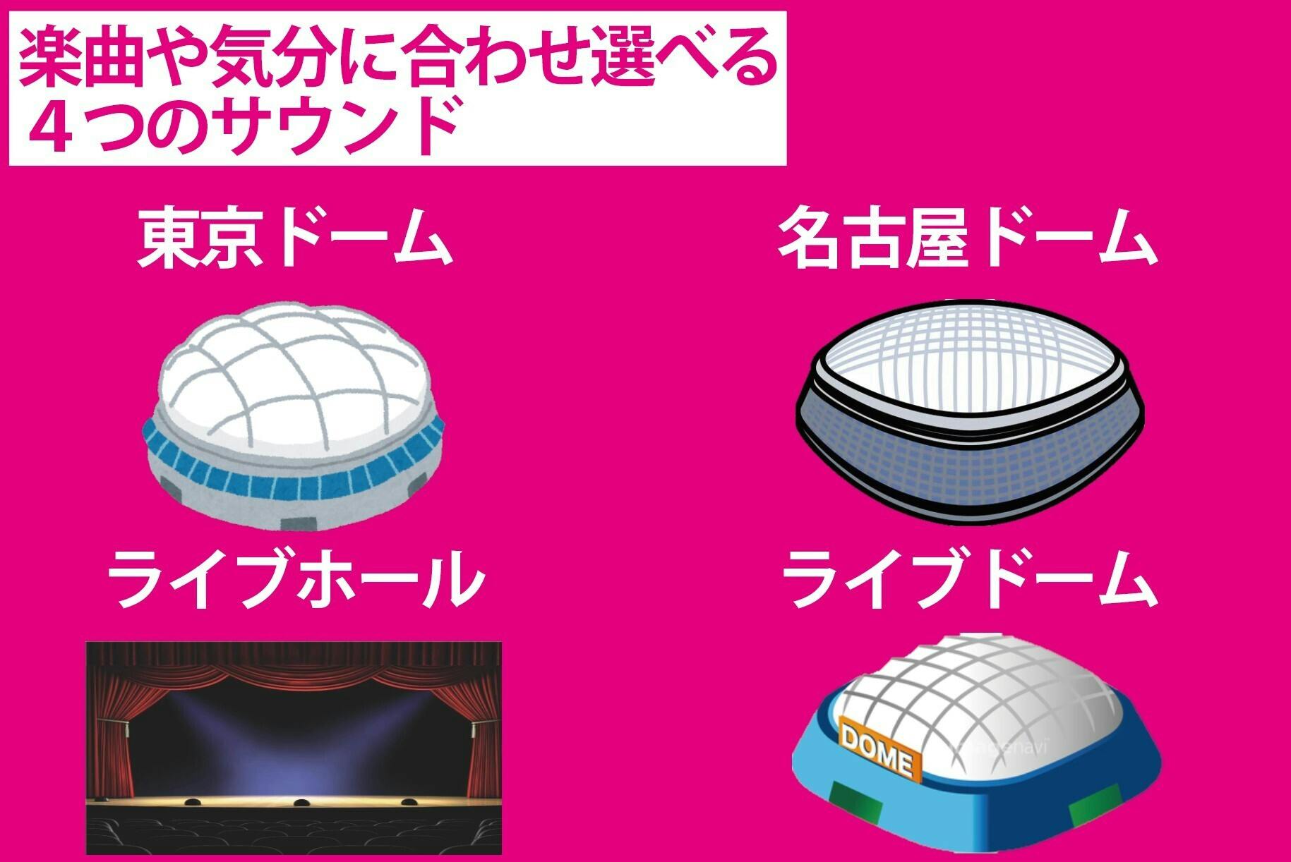 リアルな音響空間を生み出す新リバーブエフェクトを搭載し、DAMオリジナルの「ライブドーム」や「ライブホール」のほか、実在する「東京ドーム」、「ナゴヤドーム」の音響を完全再現。憧れのコンサート会場で歌っているような、リアルなライブ体験ができます。