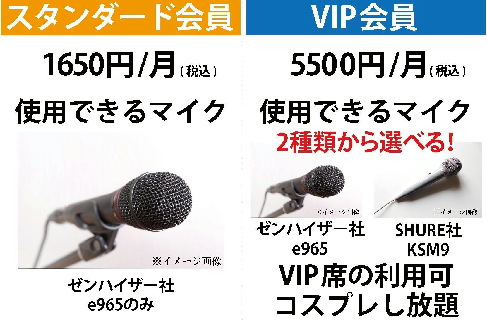 2種類の会員の違いは使用できるマイクがVIP会員の場合2種類から選べるのに対し、スタンダード会員はゼンハイザー社のE965のみとなります。