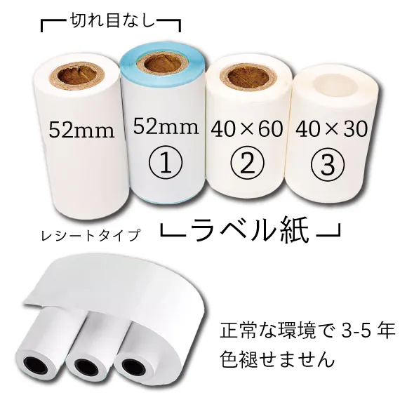 A.標準的な環境では3~5年となります。理論上は10年とされておりますが、保管状況により大きく影響を受けるのは一般的な感熱紙と同様になります。空気や光になるべく触れないように保管されることが、長持ちの秘訣とも言われております。