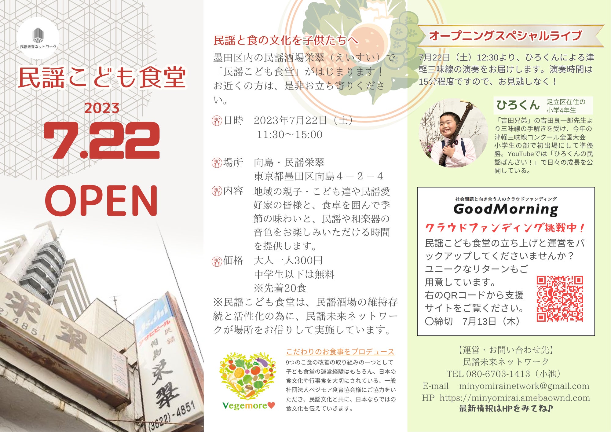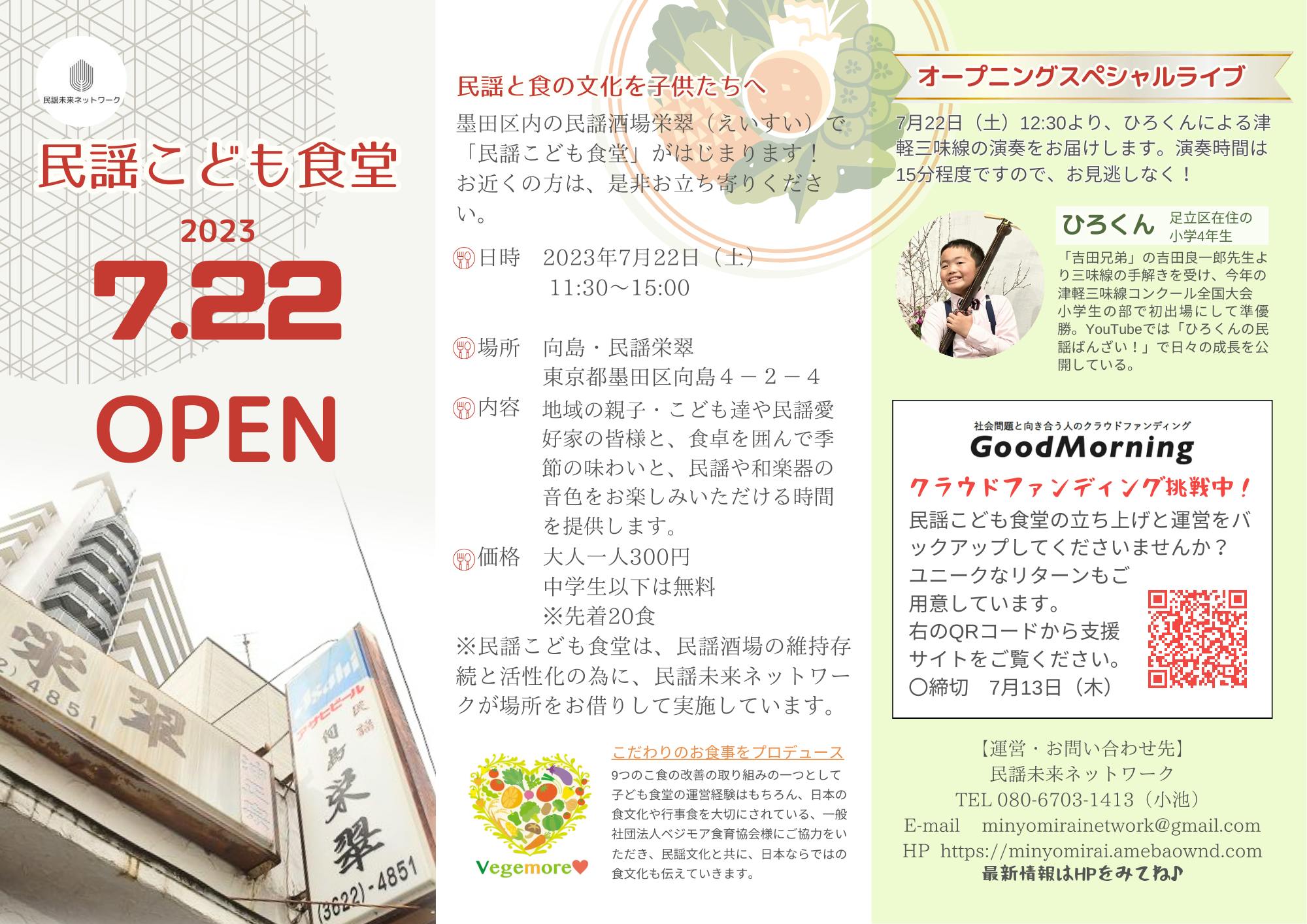 向島および曳舟界隈で民謡こども食堂のチラシを置いてくださる店舗や施設を募集しております。ご連絡を頂けましたら、ご郵送または持参させていただきます。また、差し支えなければ、PDFデータをプリントの上、ご利用をいただいても構いませんのでご協力のほど、よろしくお願い申し上げます。