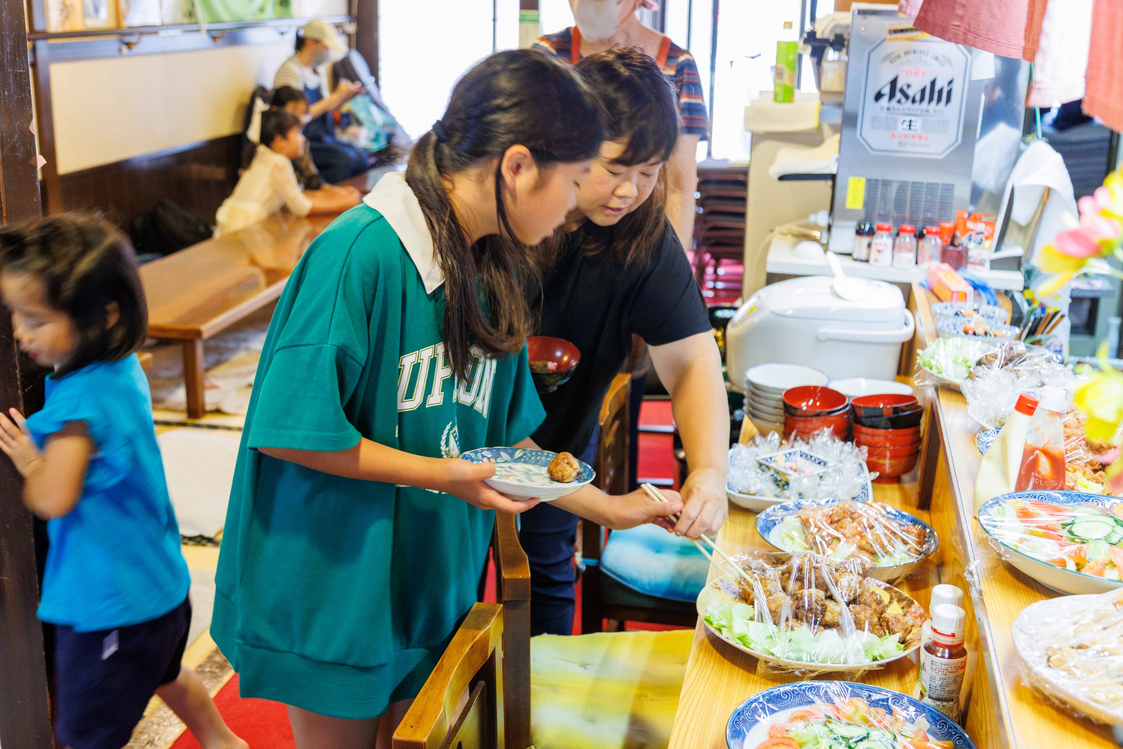 カウンターに並べられたお食事を器にとって、お席でお召し上がりいただけます。
