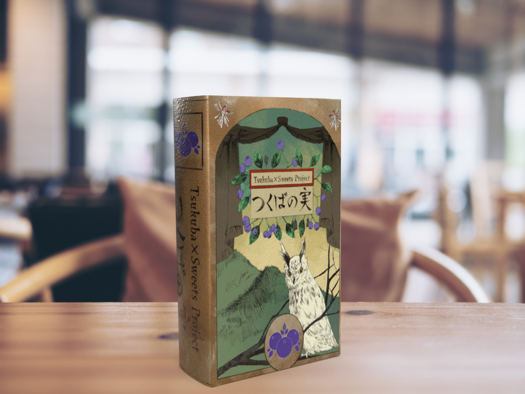 オリジナルパッケージには、ブルーベリーや市の鳥(フクロウ)、筑波山などのつくばの要素を沢山詰め込みました。パッケージの形は、つくば市は研究学園都市であることから叡智が集う町であることから、本型にしました♪