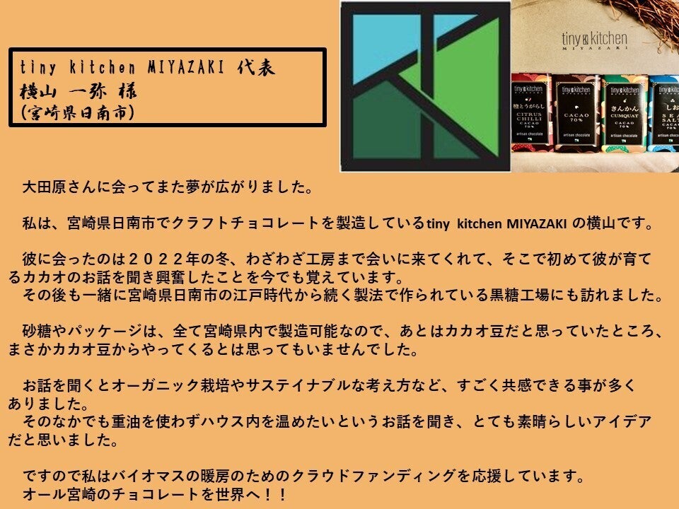 宮崎カカオを使った美味しいチョコレートが作れるようになるまでの過程も含めてお楽しみいただければと思います!