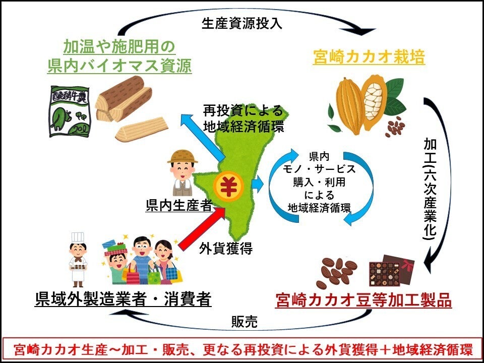 そして、宮崎県産カカオという独自の健康志向型農産物の生産が普及すれば、宮崎の基盤産業である「農業」を伸長させて、県外からのさらなる外貨流入を図り、地域経済活動の活発化に繋がると考えます。