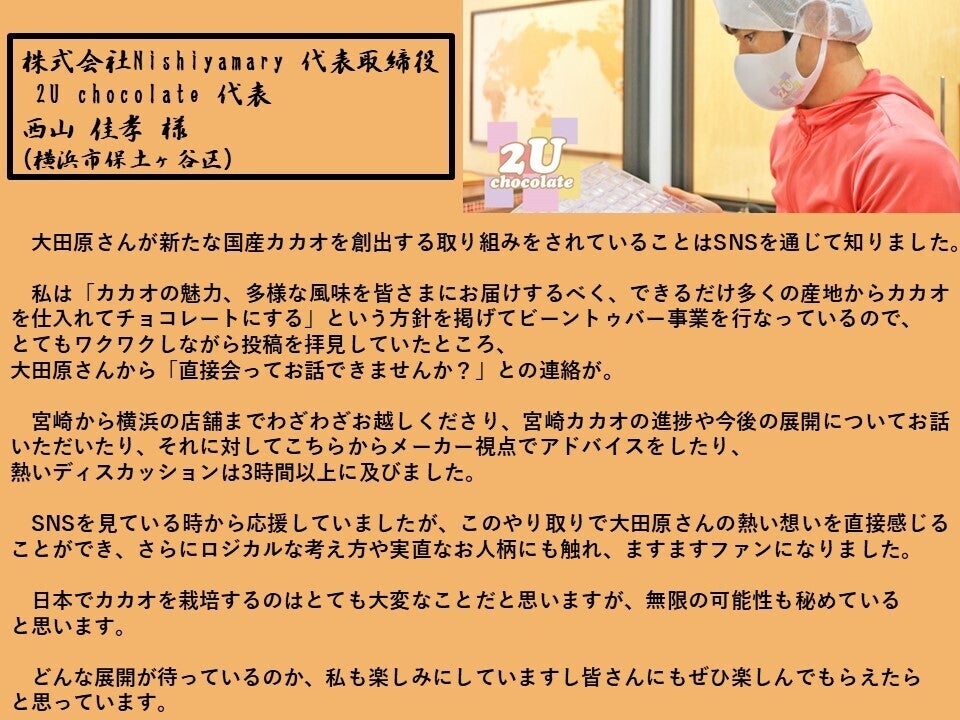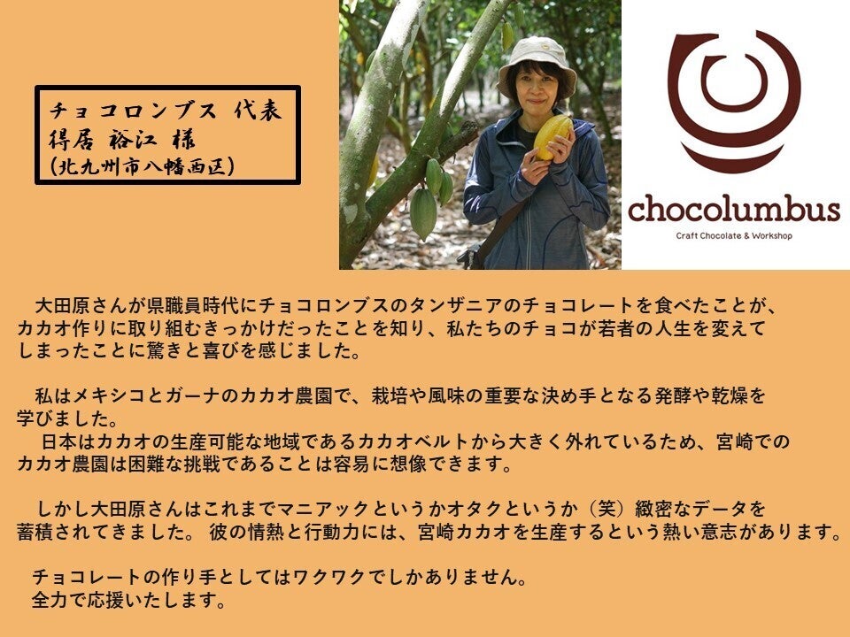宮崎カカオを使った美味しいチョコレートが作れるようになるまでの過程も含めてお楽しみいただければと思います!