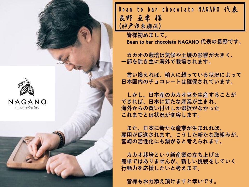 世界中のチョコレート好きを驚かせるようなチョコ原料として「宮崎カカオ豆」の生産を行い、宮崎の地域振興に繋げるため、クラウドファンディングに初挑戦します!!!