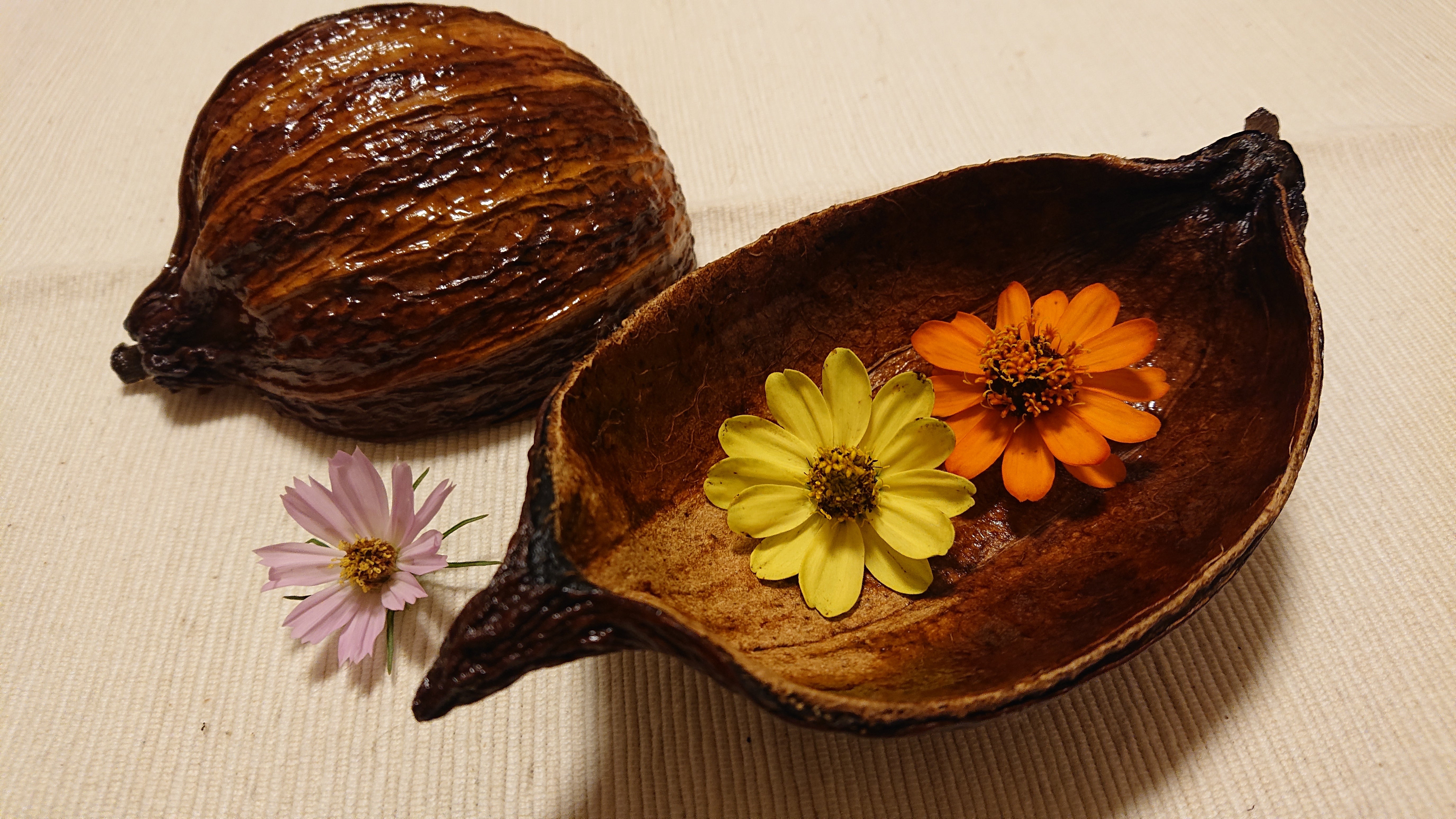 本物のカカオ果実の硬い皮を使って小物を置けるトレーにしました。