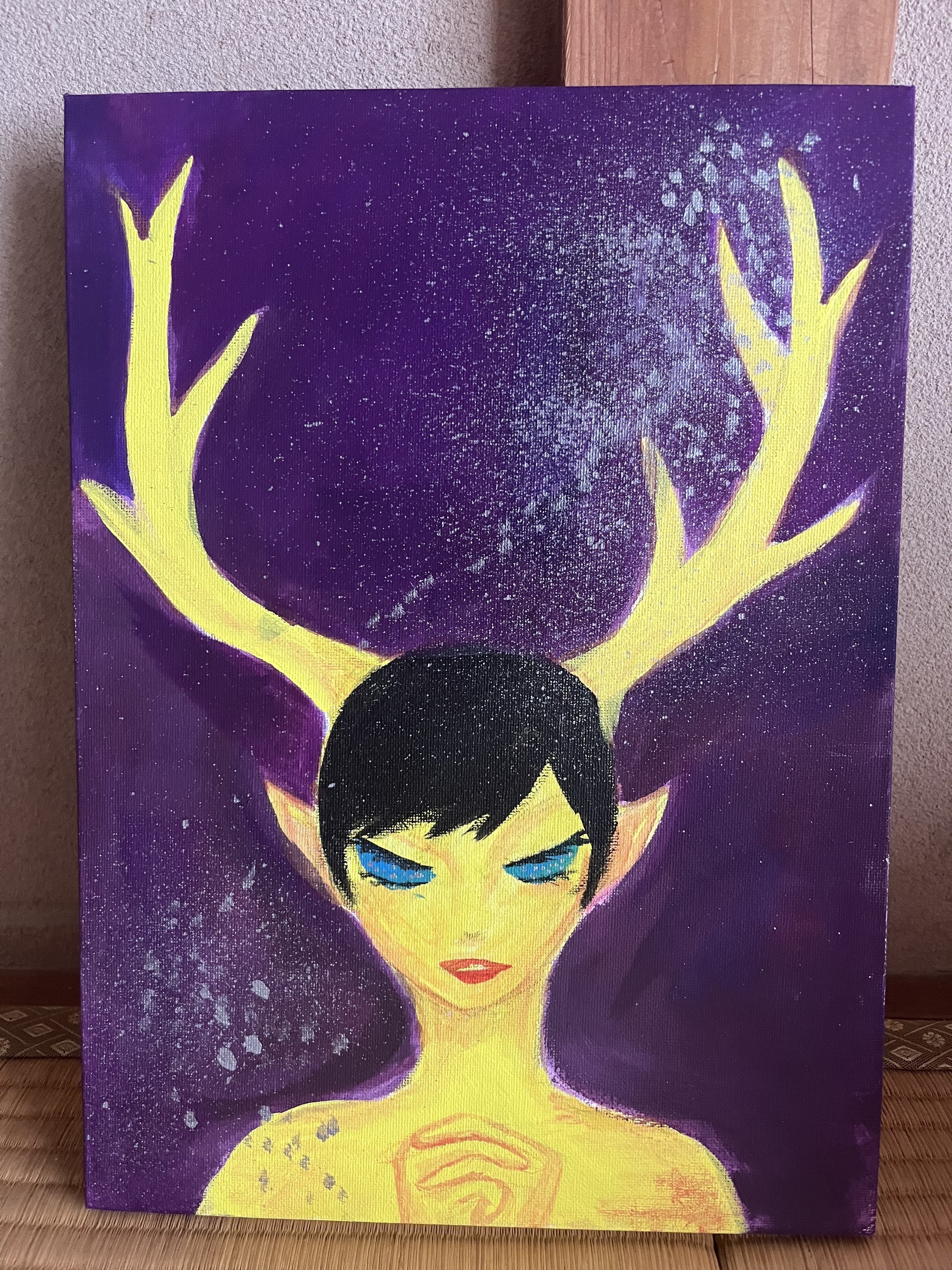 2023/06/17 14:53題名「深淵から見つめる者」作品「覚醒」の後に描いた作品です。本当にその道でいいのか?ずっと自分の心の深いところから、問いただす存在を表現しました。神秘的で、深い湖の中から悲しそうなような、怒りを抱いているような、いろんな感情が混ざったものを観る側に訴えてきます。本当にそれでいいのか?自分の深いところにある純粋な気持ちを思い出させてくれるそんな作品です。作品には、伊藤沙恵のサインをつけてお渡しします。こちらの作品は、「作品お渡しプラン」の支援者様にお渡しします。皆様のご支援心よりお待ちしております。サイズ:200mm×200mm画材:キャンバス、アクリル絵の具 もっと見る