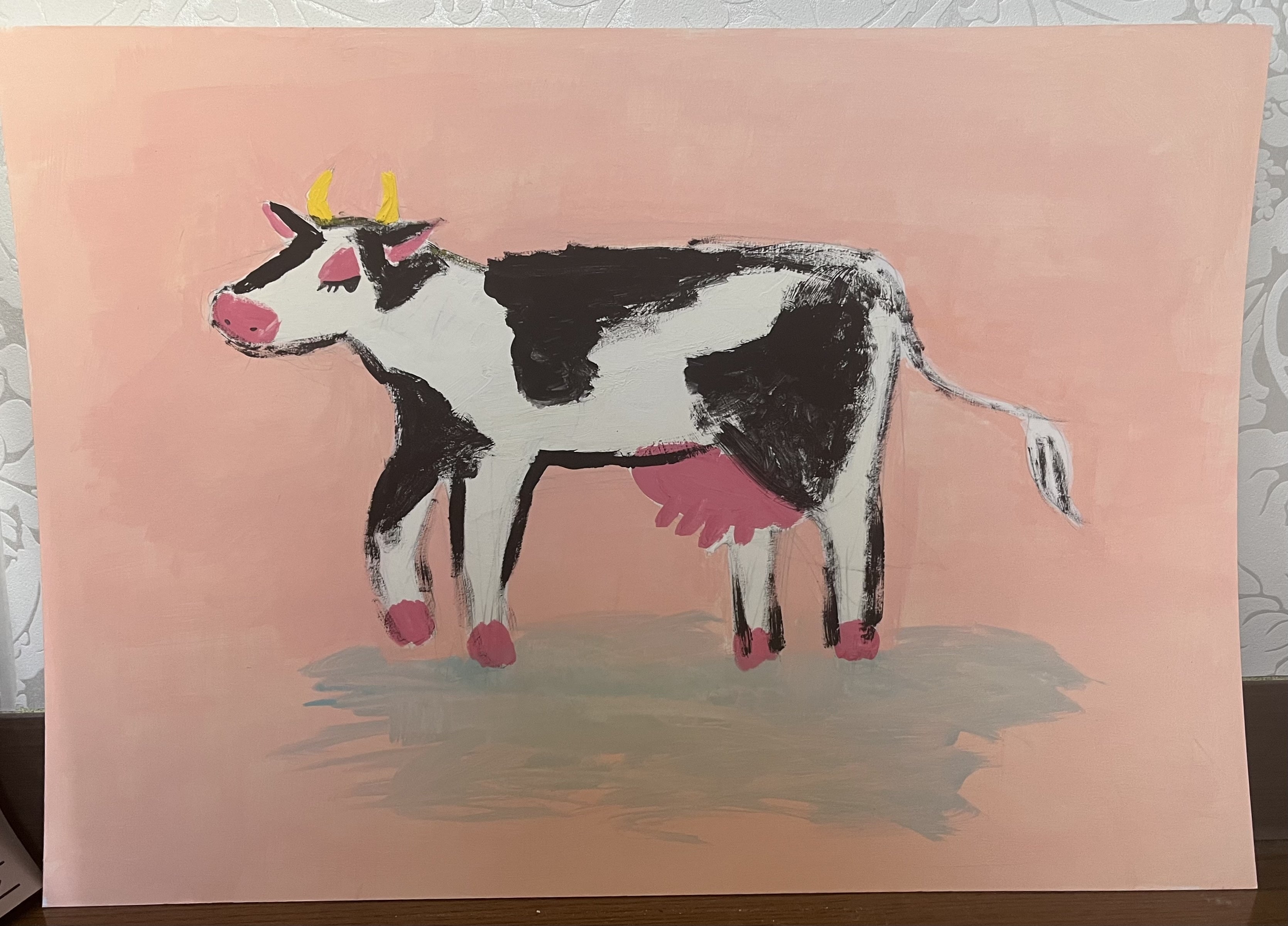 2023/06/17 14:42題名「もっと軽やかに」この作品は、亡くなった祖母をイメージした作品です。祖母は丑年で、牛のオブジェをいつも部屋に飾っていました。のんびりとした中に、どっしりとした器がある。わたしは、そんなイメージを牛に抱いていました。個展をやる、制作をするという新しい一歩を踏み出す時、最初はワクワクしても、だんだんと「こわい、、」という感情が湧き上がってきます。そんな時に、「もっと気楽に、のんびりやってもいいんじゃない?ほら、こんな感じで」とでもいうように、一歩踏み出す勇気を与えてくれる作品ができました。ホルスタイン牛は本来家畜ですが、そんなしがらみも飛び越えて一歩踏み出す牛から、みなさんが挑戦するきっかけを与えられたらと思います。作品には、伊藤沙恵のサインをつけてお渡しします。こちらの作品は、「作品お渡しプラン」の支援者様にお渡しします。皆様のご支援心よりお待ちしております。サイズ:515mm×365mm画材:イラストレーションボード、アクリル絵の具 もっと見る