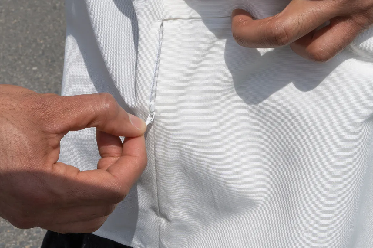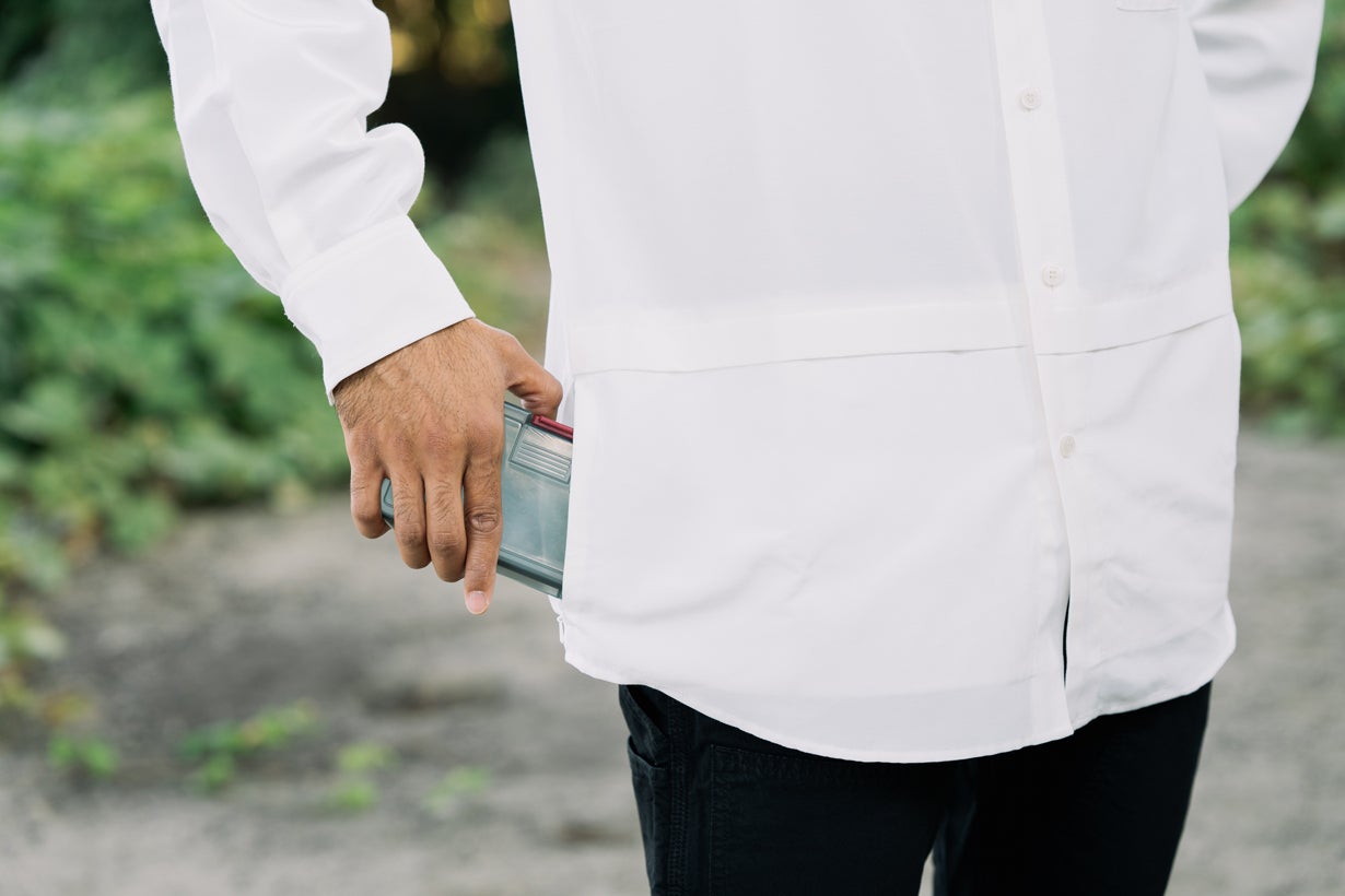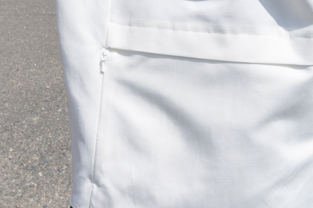 一見すると普通のバンドカラーシャツに見えますが、左右の腰のあたりに「ファスナー付きの隠しポケット」がついています。
