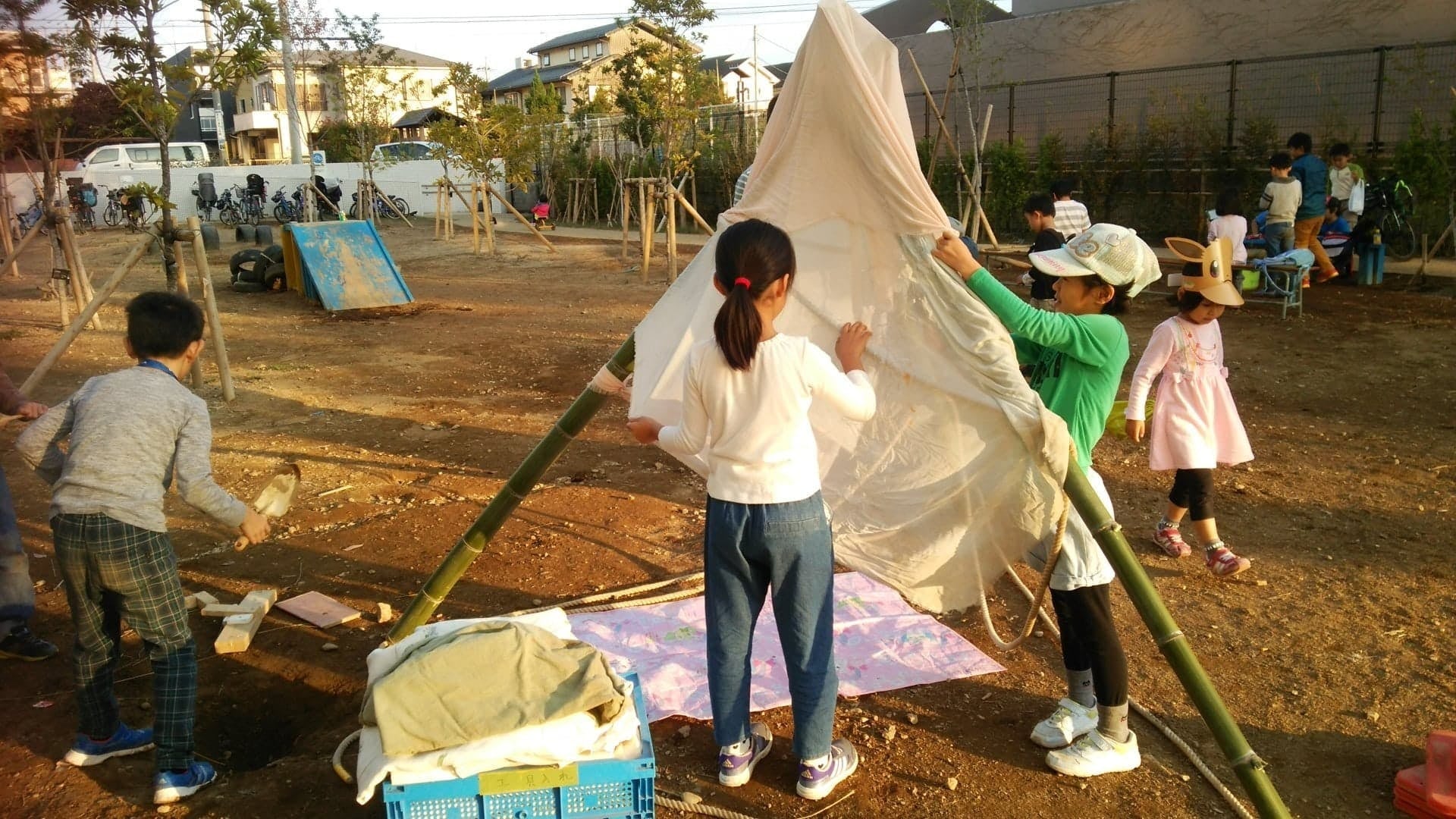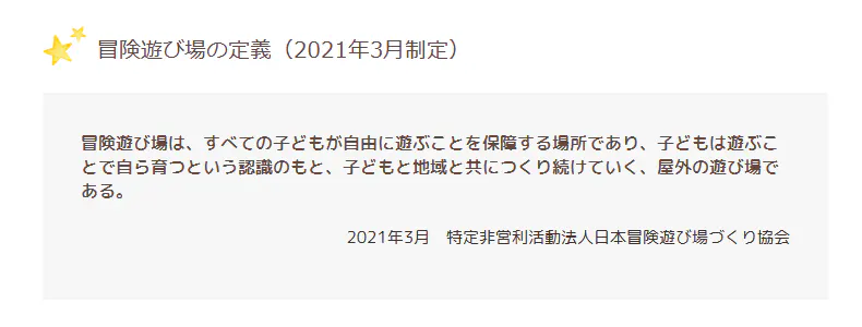 「冒険遊び場は、すべての子どもが自由に遊ぶことを保障する場所であり、子どもは遊ぶことで自ら育つという認識のもと、子どもと地域と共につくり続けていく、屋外の遊び場である」(2021年3月 特定非営利活動法人日本冒険遊び場づくり協会 https://bouken-asobiba.org/)
