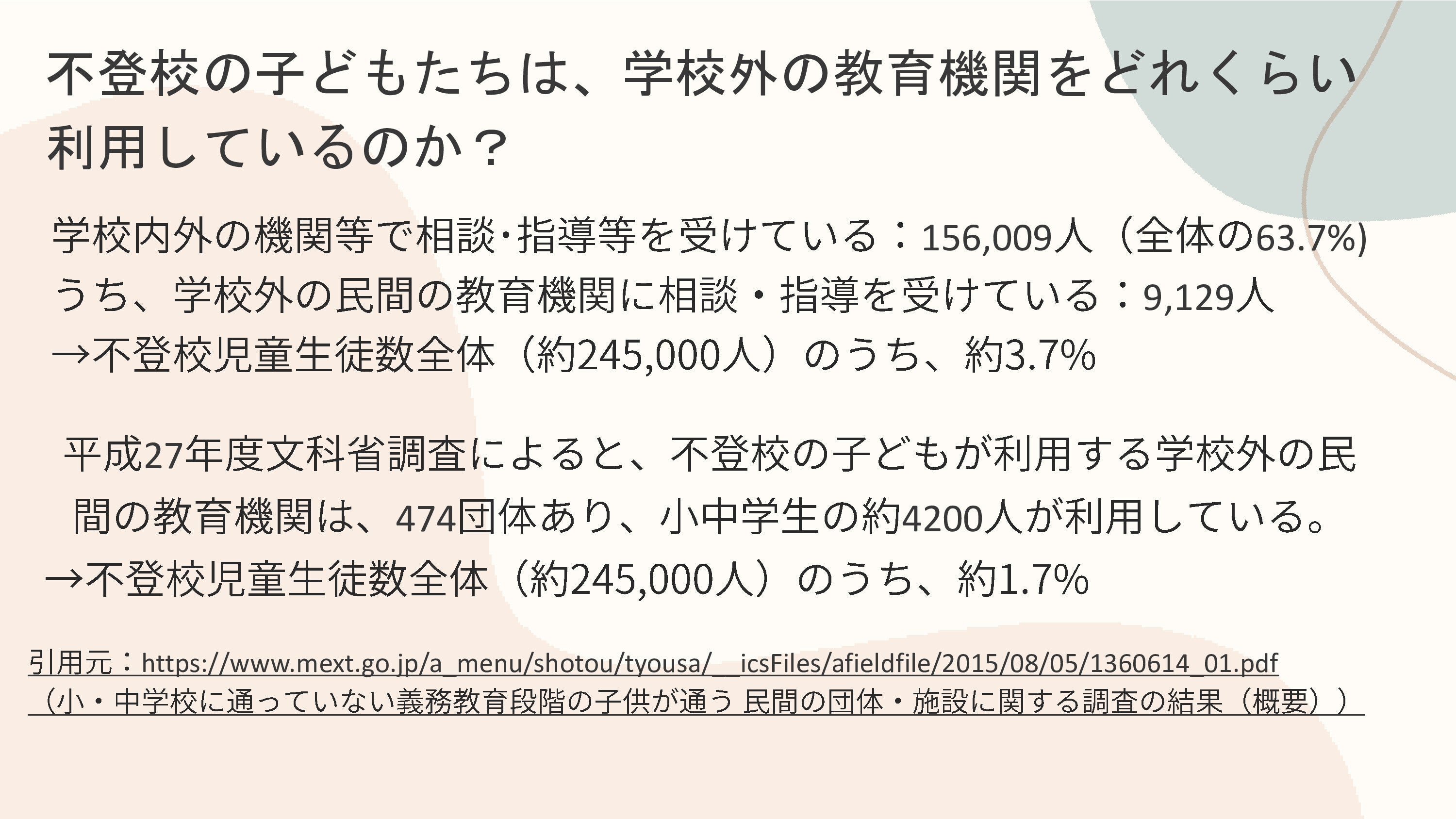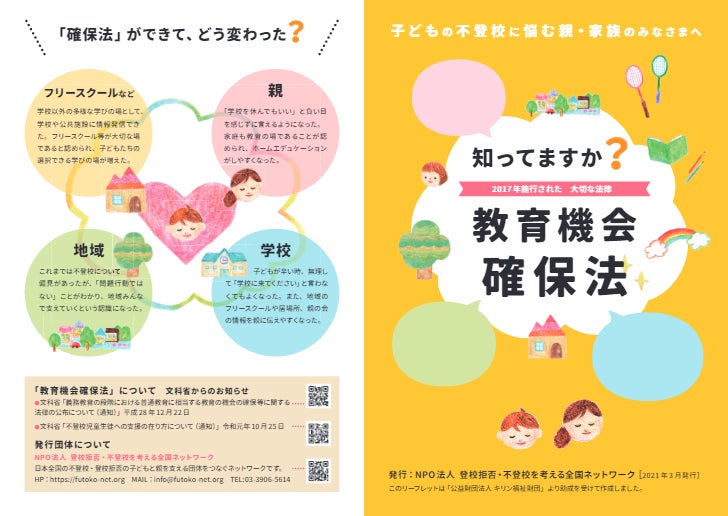2016年に施行された「普通教育機会確保法」では、不登校は問題行動ではないことや、学校復帰が目的ではなく、社会的自立を目的とした支援についての見解が出され、公民連携による学校制度外の居場所・学び場との連携もうたわれています。