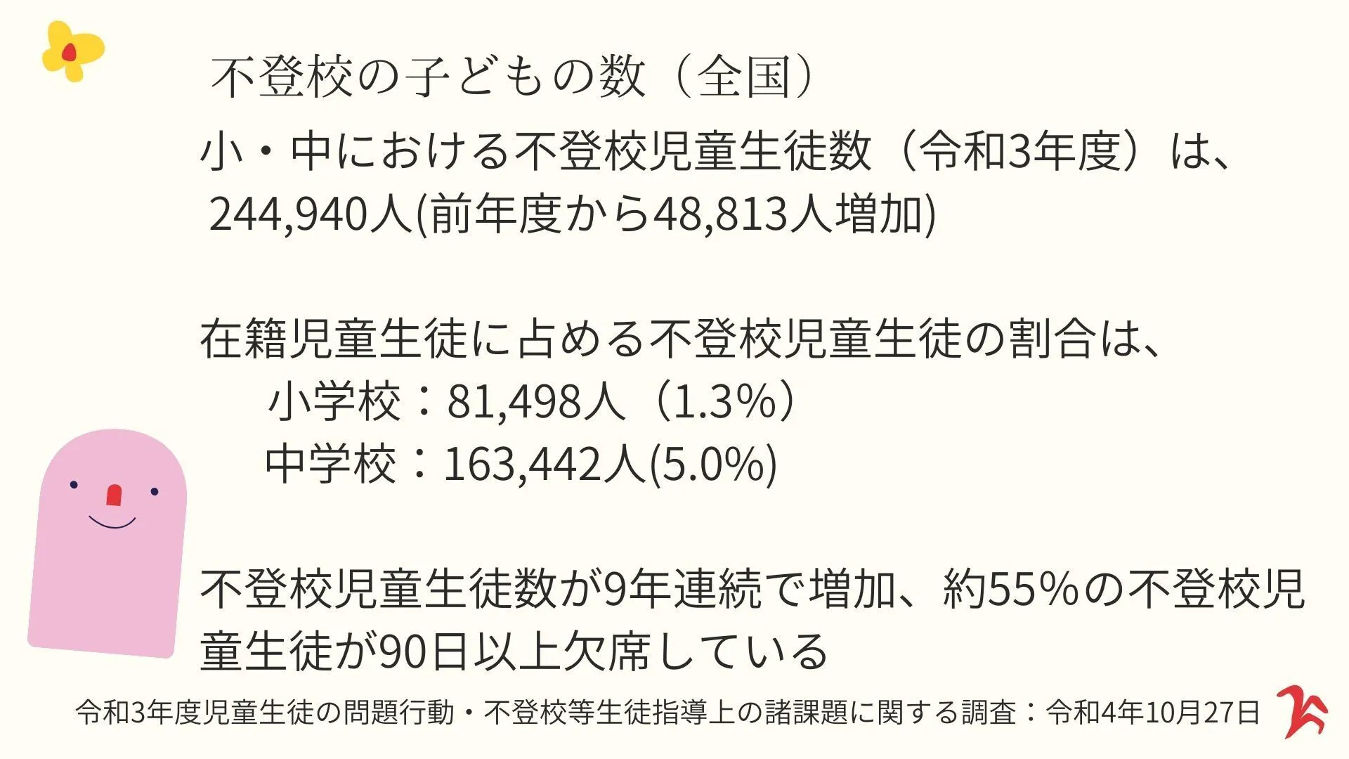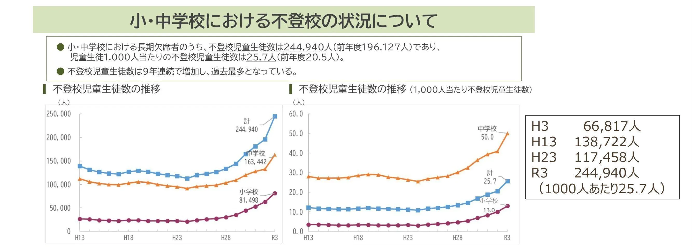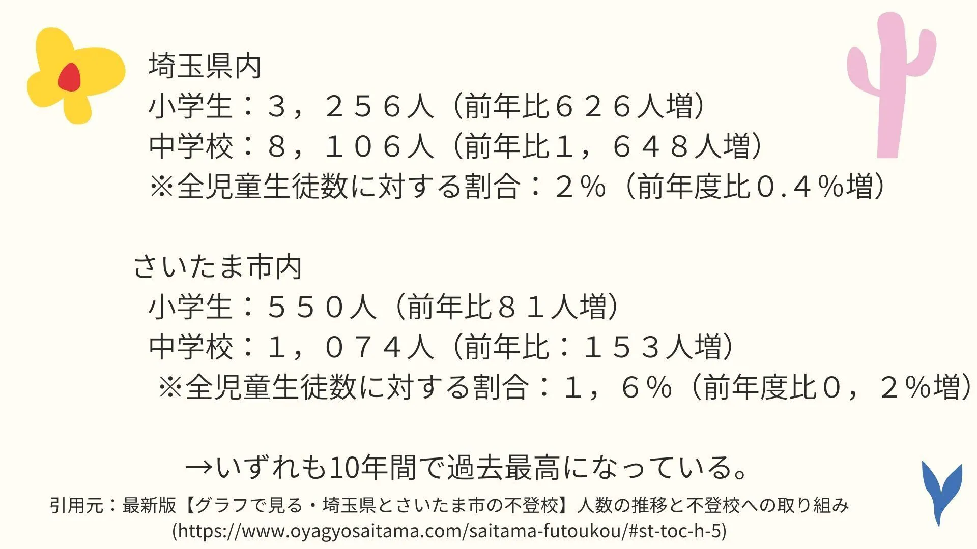 「不登校」とされるの子どもの数(小中学生)は、2021年度(2022年10月文科省発表)で約24万5千人に達し、8年連続で増加しており、埼玉県内、さいたま市内の人数を見ても、過去最多になっています。