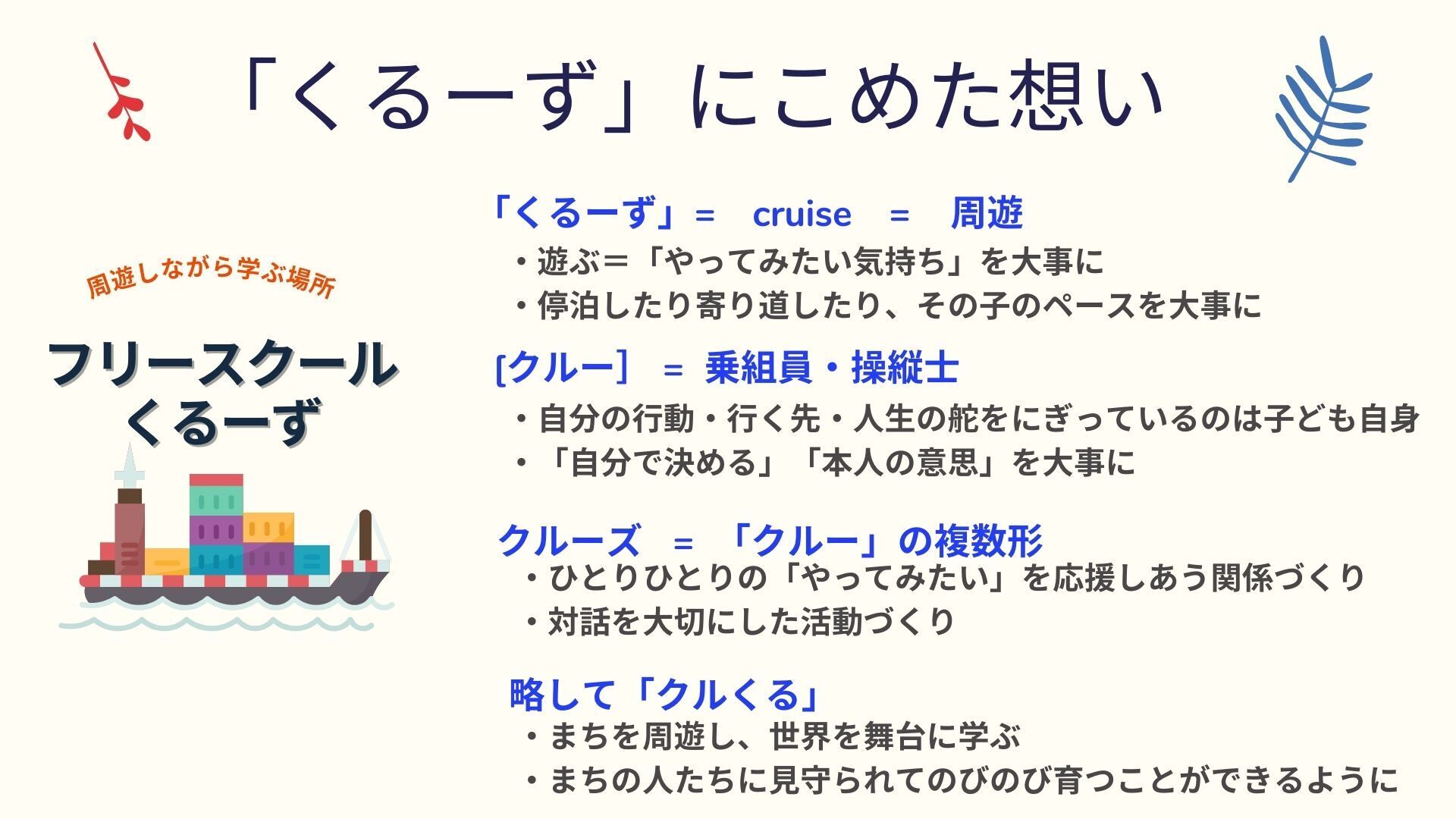 ひとりひとりが主人公。そんな「クルー」がたくさんの「クルーズ」。同じ船にのっている仲間=「クルー」として、お互いを尊重し応援しあいながらみんなで進んでいける、そんなフリースクールを目指します。