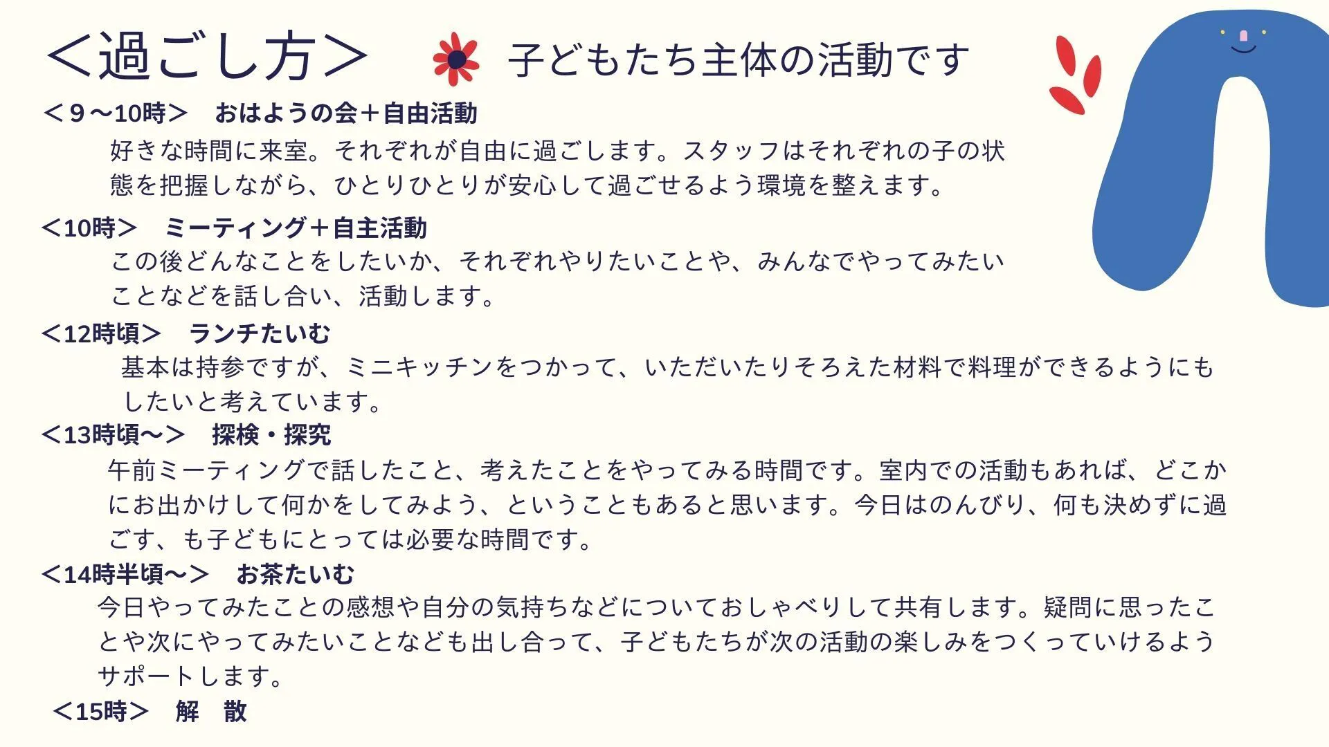 では、実際にどのようなフリースクールにしていくか、少し紹介させてください。