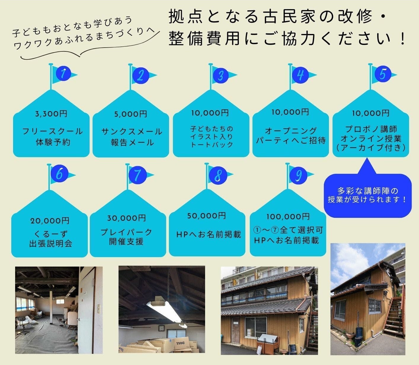 アイデアをしぼり、9種類のリターンを設けさせていただきました(詳しくはリターンのページをご覧ください)。みなさまのご支援・ご参加を、どうぞよろしくお願いいたします。