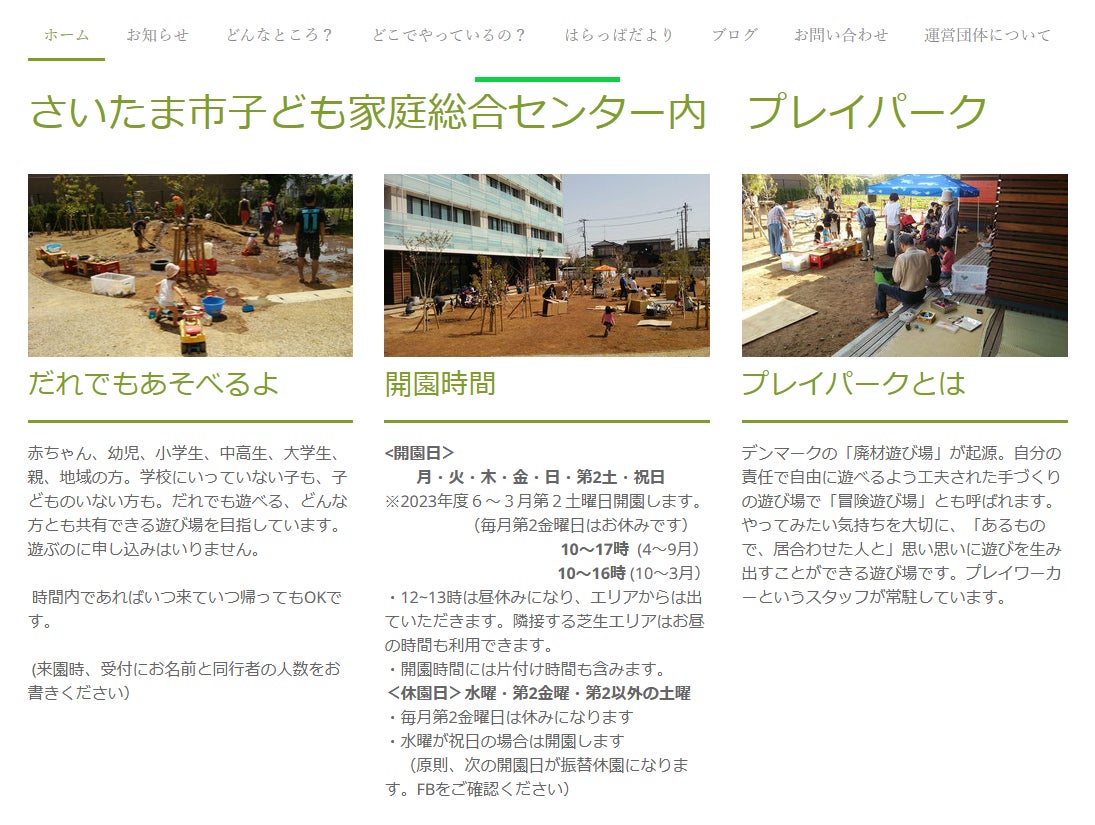 現在は、2018年にオープンした「さいたま市子ども家庭総合センター(通称:あいぱれっと)」の中の「冒険はらっぱ」という常設のプレイパークを、さいたま市からの業務委託で運営させていただいています。