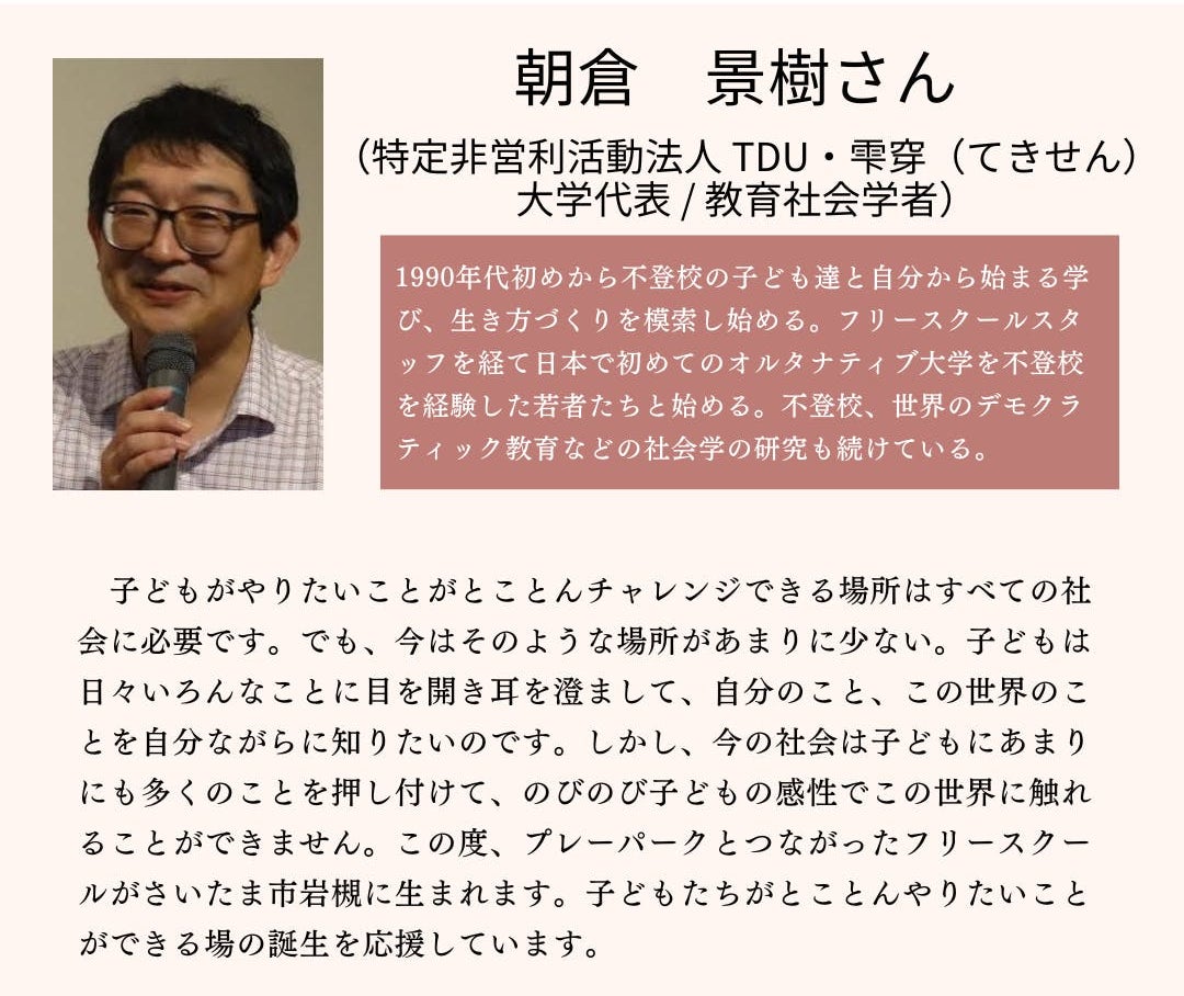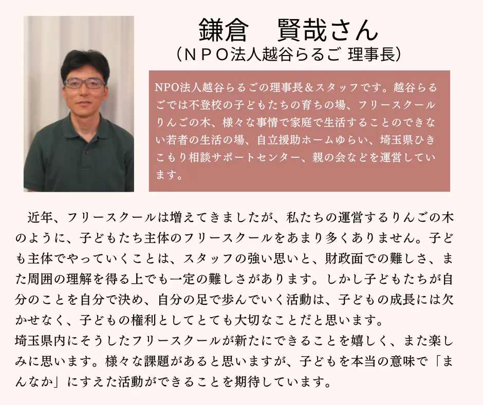 フリースクールという、制度外の学びの場をつくる上では、さまざまな課題に直面することにもなると思いますが、民間だからこそできることを、みなさまとともに行っていけたら幸いです。