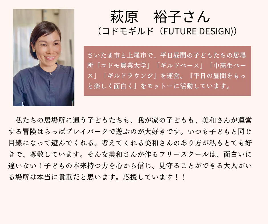 本事業は、フリースクールという場をつくるだけではなく、「誰一人取り残されない」を地域で保障することを目的に、全ての子どもたちの「やってみたい」を支えるまちづくり、子どもたちを受け止め育むことのできる地域社会づくりを広げていくためのチャレンジにもしたいと思っています。