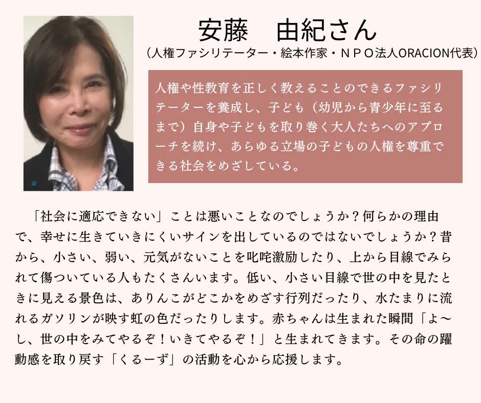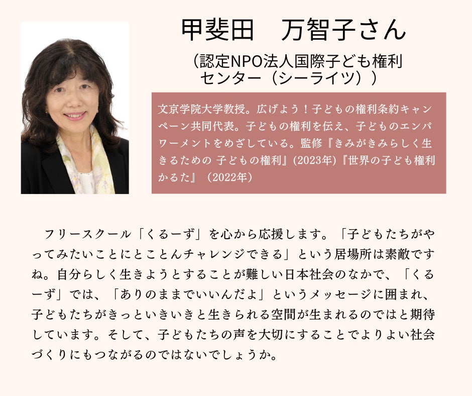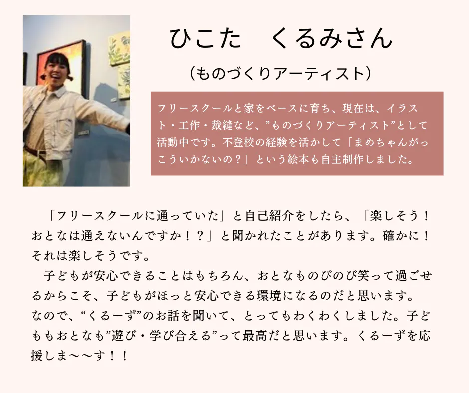 どんな子どもたちにもその子にあった安心の学びの場があり、選択できるだけの多様な場があることが望ましいと考えています。くるーずじゃなくてもいい。どうか身の周りの子どもたちひとりひとりを、どんな場にいても温かく見守り、応援してあげられる地域を一緒につくっていきましょう。