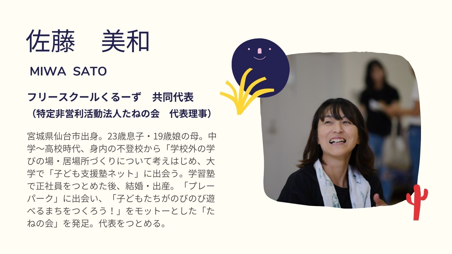 そんなフリースクールという場を、もっともっと増やしていきたい!子どもが育ち、学ぶ場の選択肢は多様であっていい!という想いを強くしていく中で、私の二人の子ども(小学生)もまた学校外の選択肢を求めるようになり、たねの会が運営しているプレイパークとの出会いがありました。そして、同じくフリースクールを立ち上げたいという情熱を持ち続けていた佐藤美和との出会いがあり、想いが一致し、今に至っています。