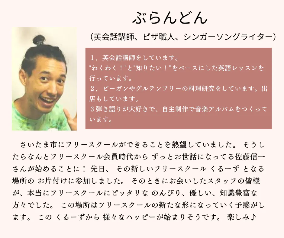 ⑨「不登校から音楽と出会うまで」 講師:ぶらんどん(英会話講師・ピザ職人・シンガーソングライター)