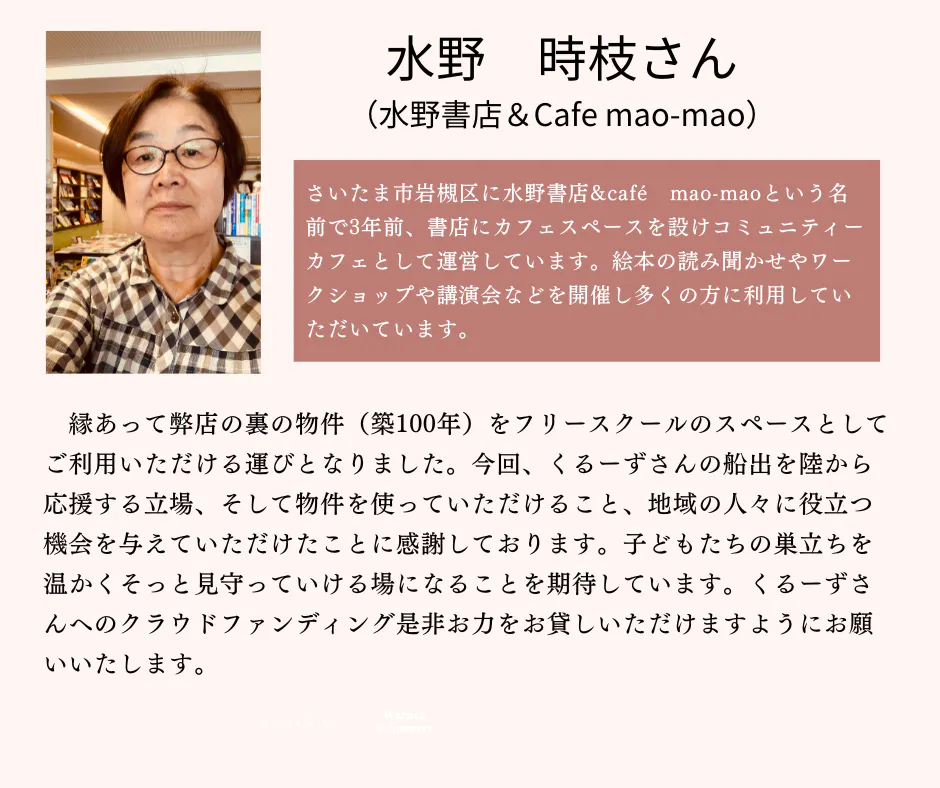私はおふたりと違いずっとフリースクールにいるわけではありませんが、少し違った立場のおとなとして、運営や企画、そして地域との連携などの面でかかわりながら、たまにくるーずにいって一緒に遊びたいなと考えています。また、昔から本を読むことが好きなので、おすすめの本なんかもフリースクールに並べちゃおうかなとも思っております。 皆さま、どうぞよろしくお願いいたします。