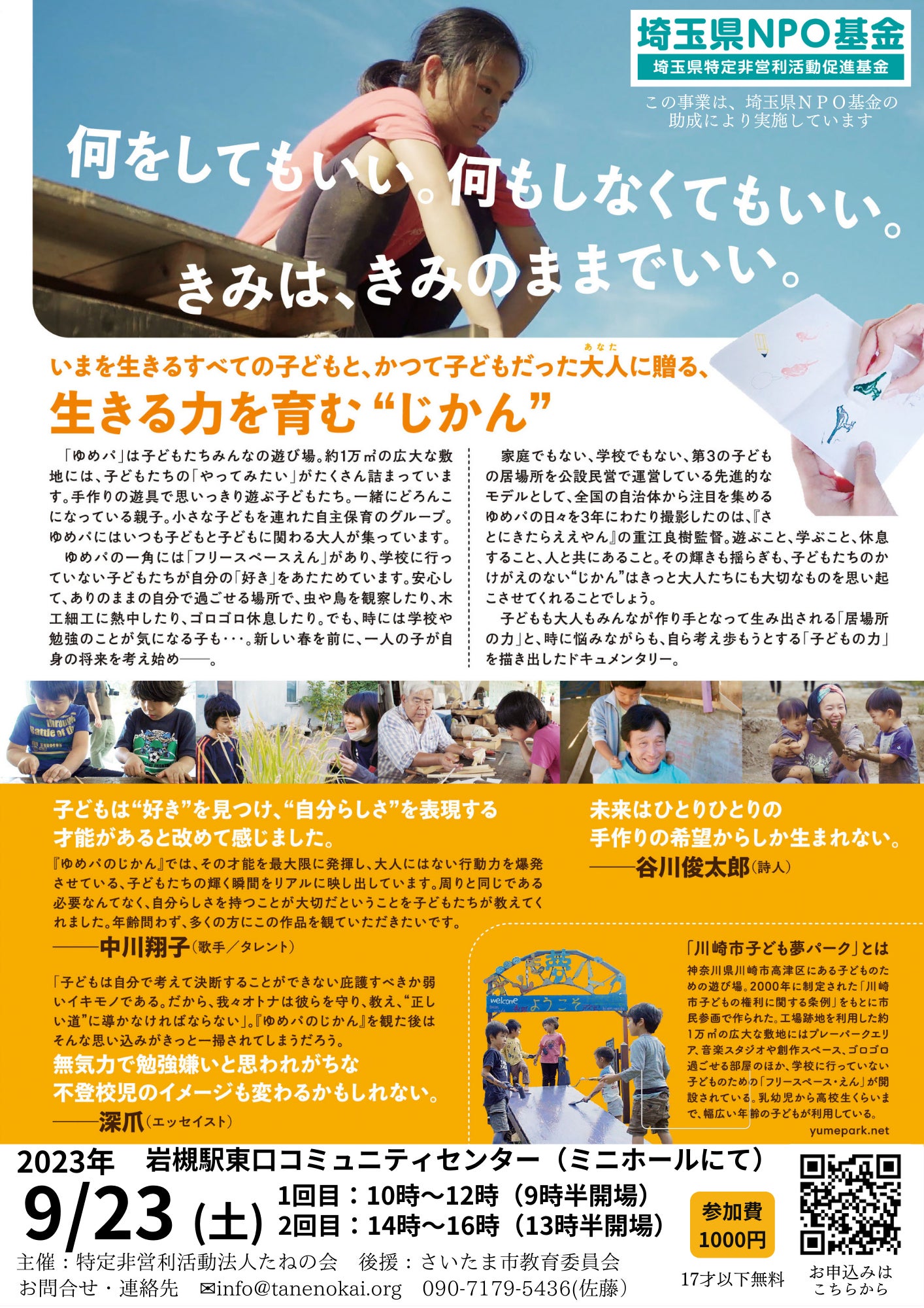 プレーパークと公設民営のフリースペースが一体となった「川崎市子ども夢パーク」で過ごす子どもたちの時間を撮ったドキュメンタリー映画です。