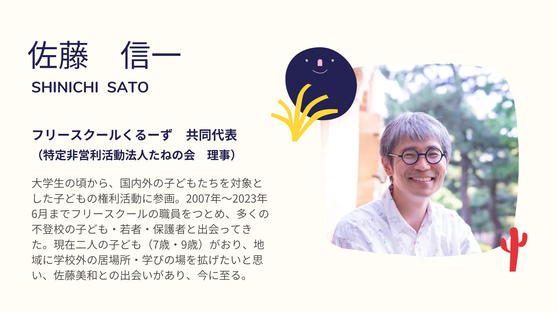 今回、佐藤美和とフリースクールを共に立ち上げる仲間の佐藤信一です(※佐藤美和とは、偶然の「佐藤」つながりで、パートナーではありません(笑))