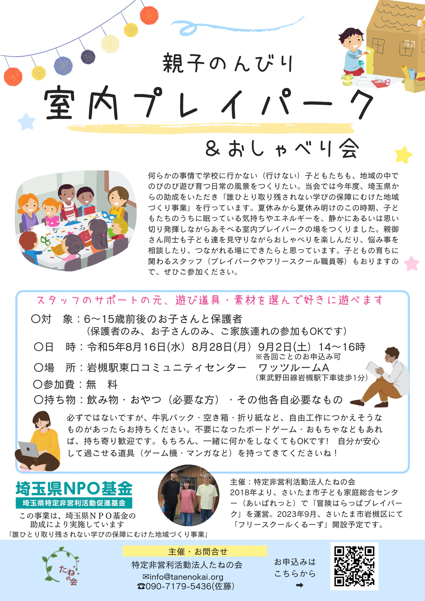 私が代表をつとめる「特定非営利活動法人たねの会」では、この度、活動地域であるさいたま市内にフリースクールを開設することにいたしました。このクラウドファンディングのプロジェクトを通して、ぜひみなさまに私たちの思いを知っていただき、ご支援をお願いしたく、このチャレンジを決意いたしました。