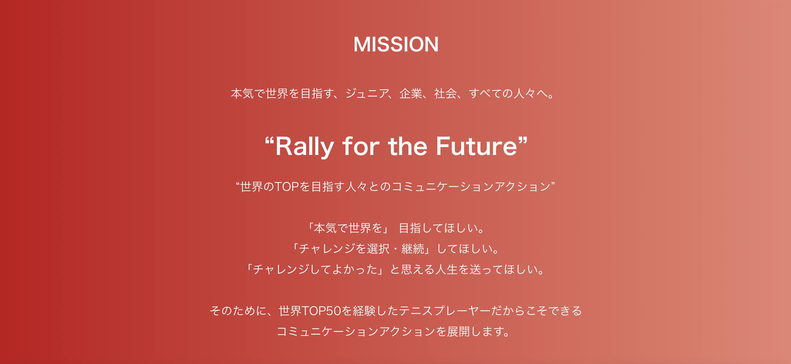 しかし、それは簡単でも当たり前でもなく、そのためにどの競技でも丁寧なジュニア育成が必須となっています。その環境整備をしっかりとやり、日本から世界へ感動を届けてくれるような、そして私たちや大坂なおみさんを超えるような選手を輩出していく支援をしていきたいと思います。