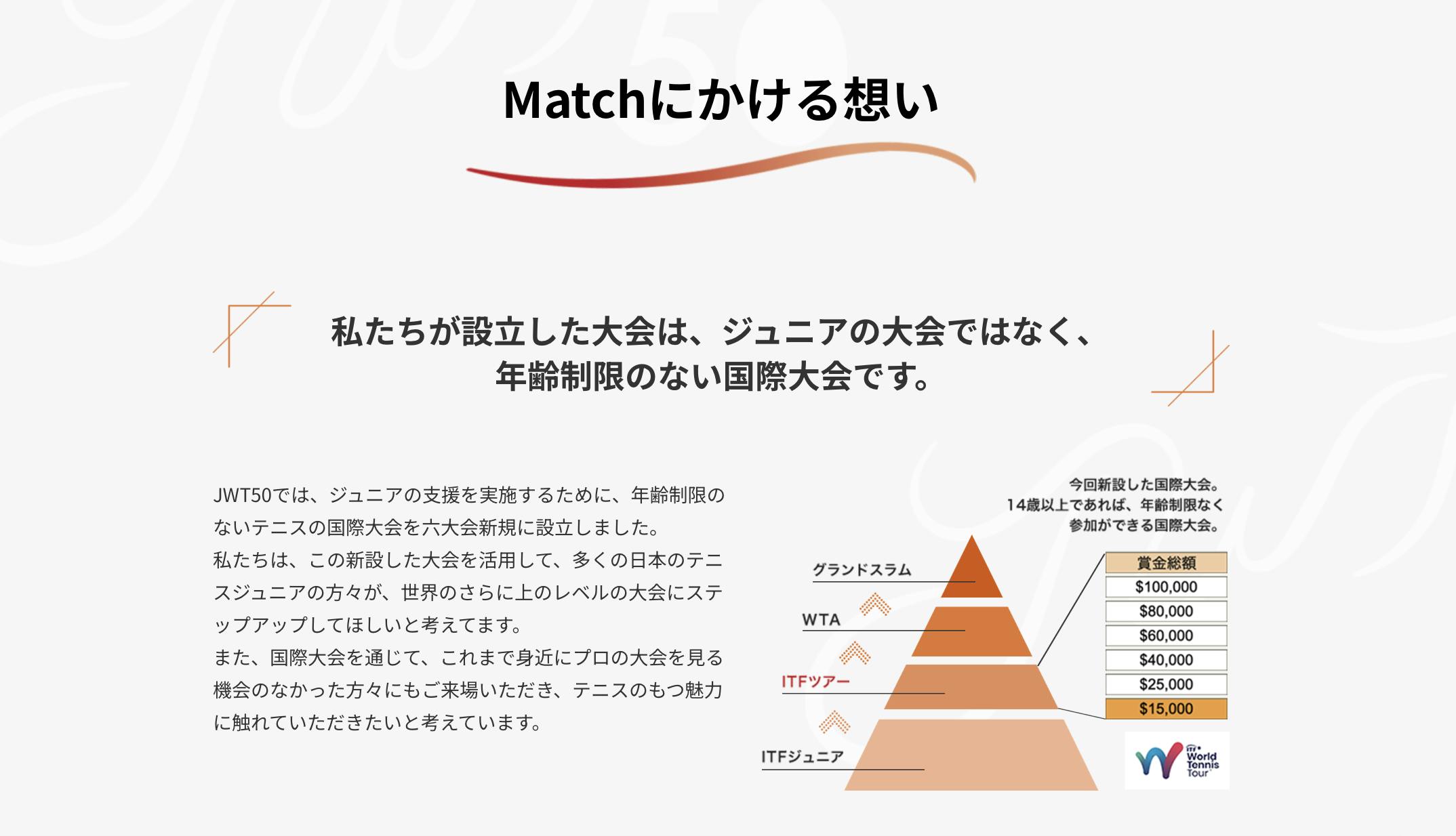 JWT50の活動としては、「ジュニア選手へのメンタリング」「デジタルメディアでの情報発信」「ITF W15の大会設立」が主な柱で、ジュニアが世界へ羽ばたく環境整備に努めていますが、特に「ITF W15の大会設立」が一つの大きな要素だと考えてきました。 日本国内では、昨年まで、ジュニアがプロのツアーへ挑戦する機会となる15000ドルクラスの大会が行われておらず、そのクラスに挑戦したい選手は海外で開催される同等のクラスの大会に出場するしかありませんでした。しかしながら、いきなりの海外遠征は費用面や言語を含む環境面での負担が大きく、その上、必ずしもポイントが取れる保証がないどころか、そもそもポイントを持っていないままエントリーしているため、現地に行っても出場できるか否かもわからないという厳しい状況にありました。それを打破するためには、日本でそのクラスの大会が設立されることが重要なポイントであると考えました。