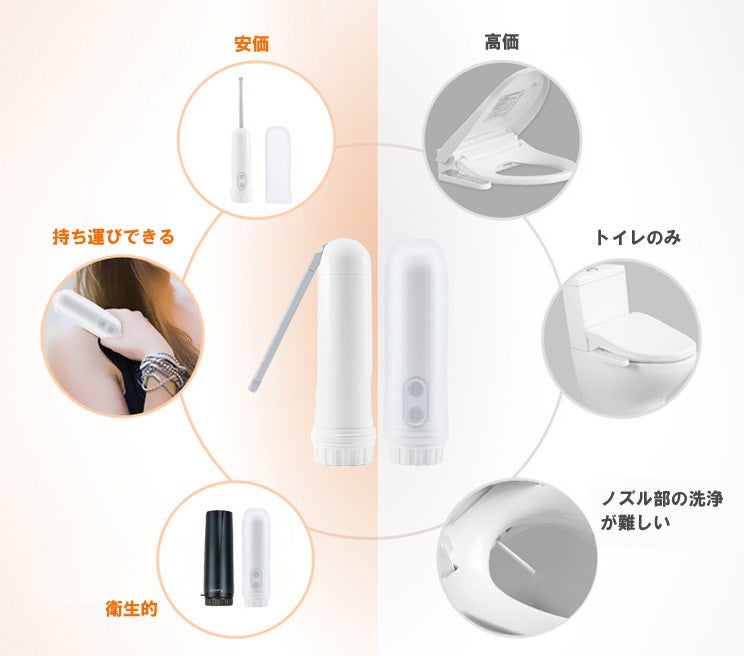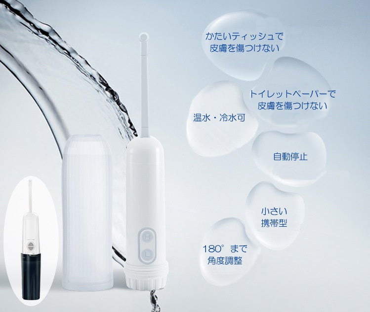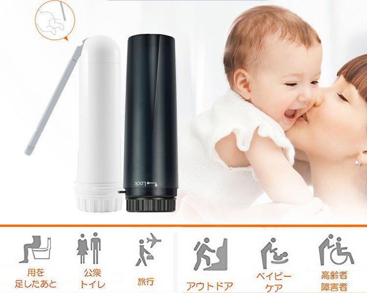 いつでもどこでも使用可能:小型で軽量なため、旅行や外出先でも手軽に使用することができます。ウォシュレットがないトイレや、トイレットペーパーが不足している場所でも、自分自身の衛生を確保することができます。
