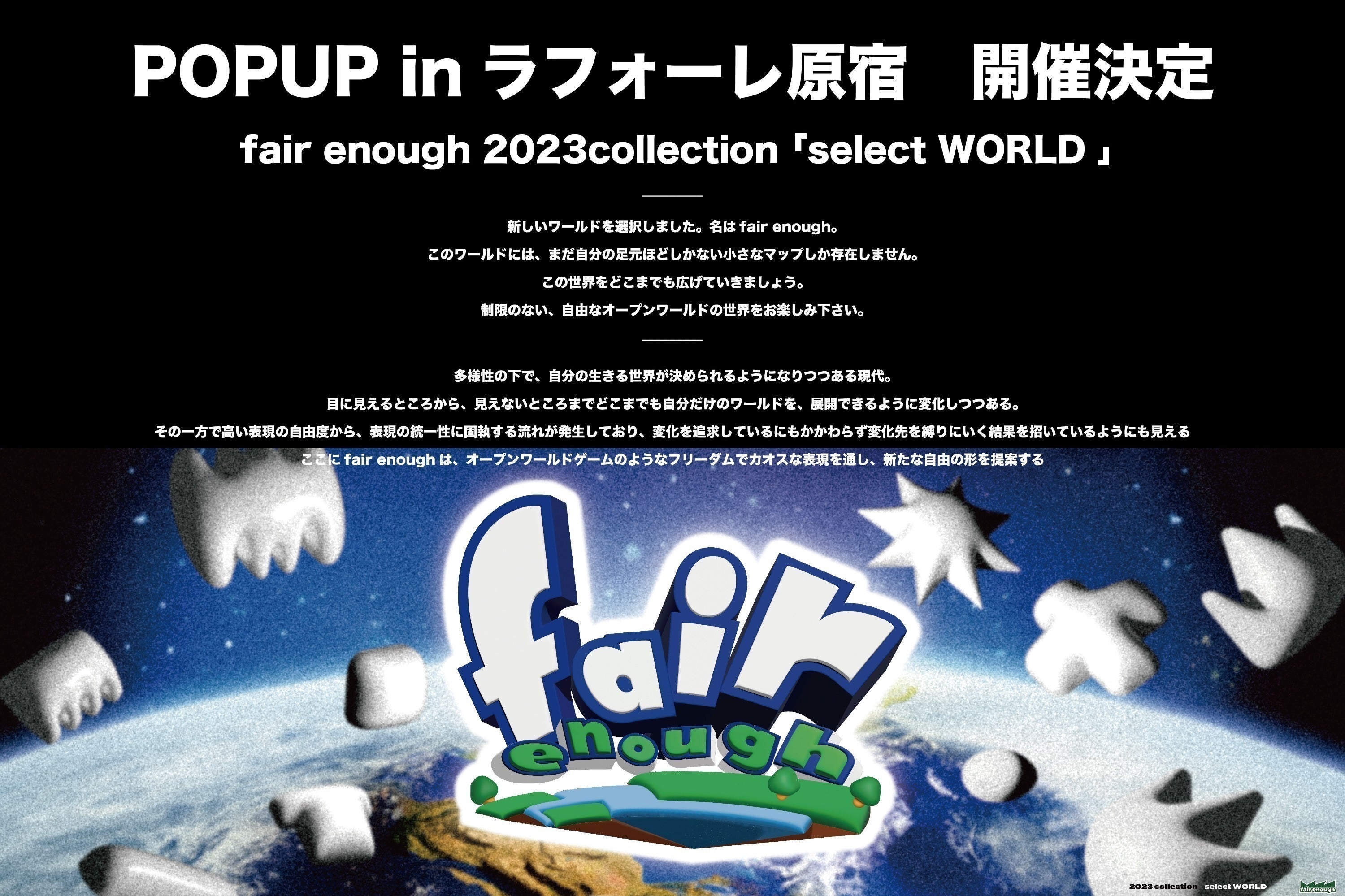 2023/06/26 07:09今回は、今季のコレクションに関してお話しさせていただきます。 皆さんは今までにゲームをプレイしたことがあると思います。ここでいうゲームとは、ゲーム機などを通じてプレイするものを指します。このゲームというものは、プレイするだけで現実では体験できないようなファンタジーの世界へ連れて行ってくれるものから、逆に平凡なリアルさを追求したものまでバリエーションは多岐に渡り、常に新しい体験を提供してきてくれました。 その中にもステージを選択してからスタートするタイプがあると思うのですが、私が思うに世の中はまさにこのステージセレクトのタイミングであり、今までぼんやりしていたものが段々と明確な形を成したステージとして出現したように感じています。というのも、最近では性自認や性的指向に関してセンセーショナルに報道されよく話題に上がりますが、このような動きは以前からありました。ただ今になって人々の関心を多く寄せているのには、”表現そのものにしっかりとした棲み分けが始まってきた”ということが関係しています。例えば時代によっては良しとされたいたアバウトな表現にも、よく考えたら実はさまざまな要素が含まれており、中にも悪い要素が含まれるのなら良くしていきたいと共感を生んでいるということです。「他人にされて嫌なことはしない」この誰もが習うこの単純明快な考え方が一周回って重要視されているのではないでしょうか。先ほど話した性に関しても、理解のできない異物として排除を繰り返されものが、理解できなくても排除されるべきではない上に、どのような人たちでも安心して暮らしていけるステージを用意するべきと変化してきたのです。これは勘違いされがちですが、完全に切り離してしまおうということではなく各々のパーソナルスペース、落ち着けるテリトリーを用意しようということです。 話は戻りますが、皆さんはゲームでのステージセレクトのタイミングに何を思っているでしょうか。私はとってもワクワクします。やっと買えたゲームであったり、プレイを続けてアンロックできたステージは正にまだ見ぬ世界です。緊張しますし、どのように楽しませてくれるか心が躍るような感覚で満たされます。皆さんの中にも、そう思う方がいらっしゃるのではないでしょうか。 では現状どうでしょう。先程いまの時代は様々なステージが用意され、良い方向に進んでいるように話しましたが、これは同時に混沌の時代でもあります。元々小規模だったムーブメントが、突然全体的なものに変わったのですから無理もありません。いつの時代も新しいものは、どうしても受け入れ難いものです。ですが私はこの混沌を経験した上で、誰もがワクワク感を感じれるようになることを願っています。 今回のコレクションはその手助けになるようなものとなります。決して強引ではなく、ゆっくりと感覚を共有していくようなものにしていくつもりです。8月に控えたラフォーレ原宿では。そのようステージを作り込んでお待ちしておりますので、少しでもワクワクしてくれたら嬉しいです。よろしくお願いします。CD MAHANA_______________________________________________________________________2023 collection “select WORLD ”__________________________________新しいワールドを選択しました。名はfair enough。このワールドには、まだ自分の足元ほどしかない小さなマップしか存在しません。この世界をどこまでも広げていきましょう。制限のない自由なオープンワールドの世界をお楽しみ下さい。__________________________________多様性の下で、自分の生きる世界が決められるようになりつつある現代。目に見えるところから、見えないところまでどこまでも自分だけのワールドを、展開できるようになってきている。その一方で高い表現の自由度から、表現の統一性に固執する流れが発生しており、変化を追求しているにもかかわらず変化先を縛りにいく結果を招いているようにも見えるここにfair enoughは、オープンワールドゲームのようなフリーダムでカオスな表現を通し、新たな自由の形を提案する_______________________________________________________________________・会期 8/4(金)~8/16 (水) 8.9休館・営業時間 11:00~20:00 最終日のみ19:00まで・会場 ラフォーレ原宿2F CONTAINER 東京都渋谷区神宮前1-11-6 もっと見る